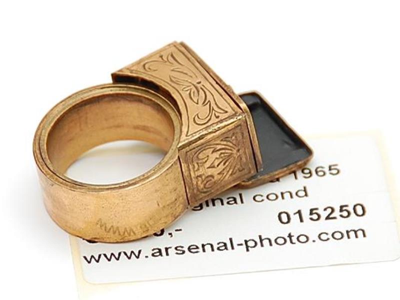 A miniature KGB ring camera. The top cover of the ring seems to open up to reveal the lens.