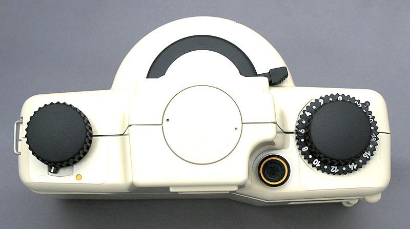The Horizon Kompakt was manufactured by KMZ specifically for the Lomographic Society. Although Lomographic Society members would probably disagree with me, this is not a camera for the serious panoramic photographer. The body is based on the Horizon 202, but beyond that it bears little resemblance to it. The Horizon Kompakt has no lever wind and has only a simple fiction-driven frame counter. There is no provision for using a cable release or tripod. It is not even supplied with a hand grip. The lens-swing has two speeds, but only a single shutter speed on each, 1/60 and 1/2 second. There is no interlock between shutter cocking and film advance, so multiple exposures and blank frames are possible. There is no spirit level and no means of setting the aperture, which is fixed at f/8. The lens is an MC Industar 8/28. The complete kit consists of the camera, plastic case and Lomography picture book.
