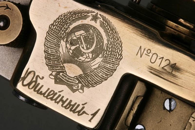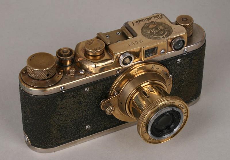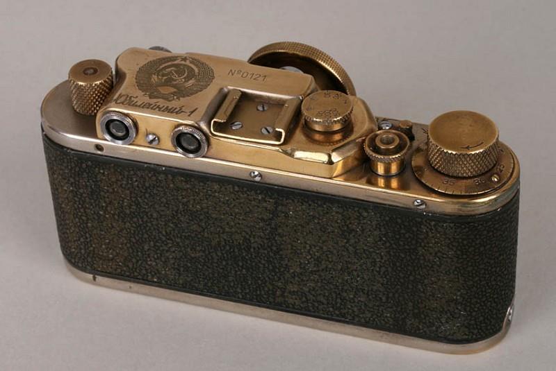 Made from a 1950s Zorki (1c or 1d) with the chrome polished down to the brass, the original engravings of the logo and serial number on the rangefinder housing removed and replaced with the engraved serial No. 0121 and a beautiful and accurate emblem of the great Soviet Union, acid-etched with great detail into the surface of the metal. All of the small writing in the seal of the USSR can be read under magnification!