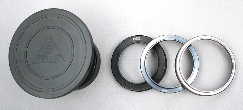 The FAN-1 is a wide-angle converter manufactured by ART-Filmotechnik in Minsk, Belarus. It fits on the front of the standard lens using the filter thread, and comes with adapter rings to fit M52, M58 and M62. According to the instruction leaflet, M55, M67 and Rolleiflex bayonet adapters are also available. Fitting this adapter to say a Volna-3 80 mm lens converts it to 50 mm, and fitting it to a Helios-44 50 mm lens, converts it to 31mm (i.e. a factor of 0.63). It can also be used on projectors and enlargers.