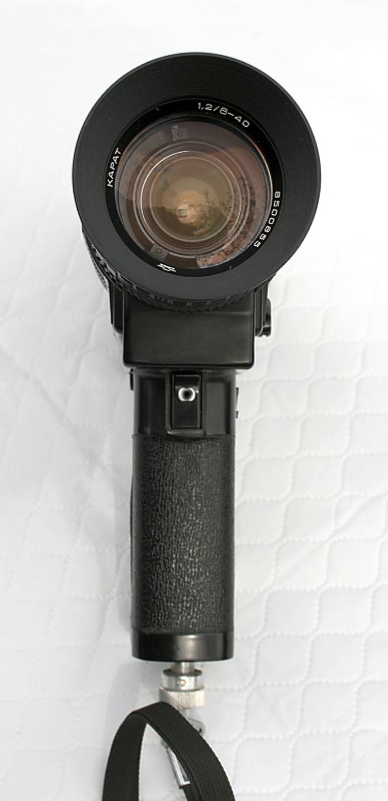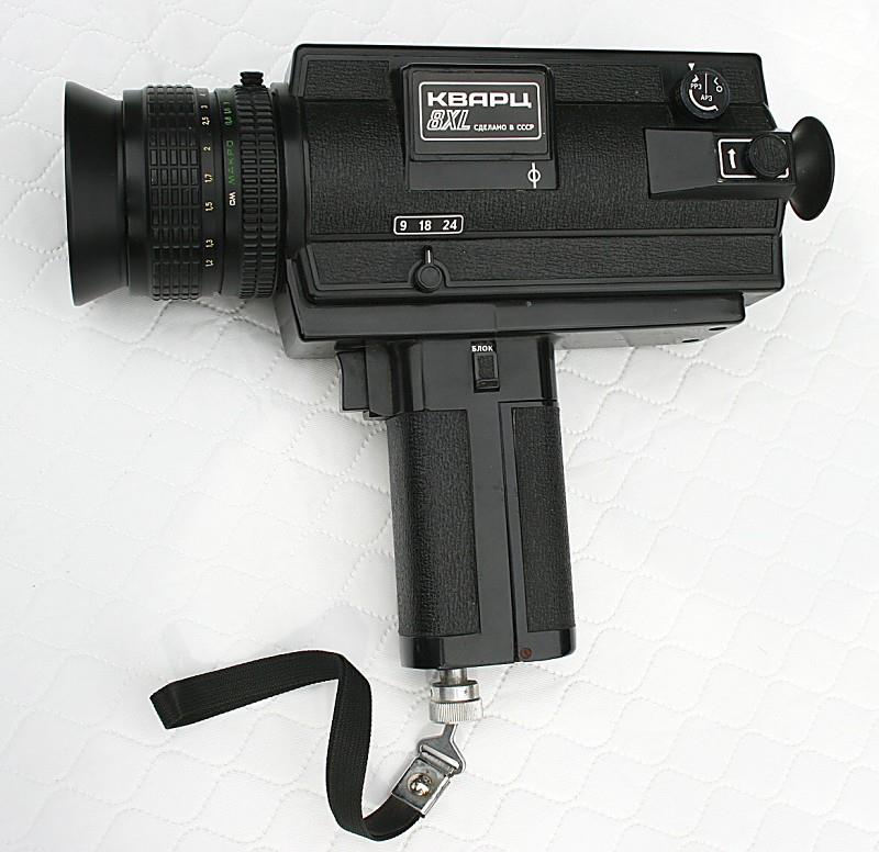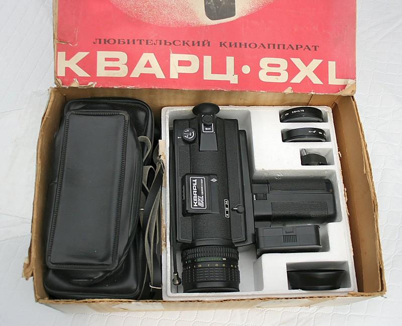 The Quarz 8XL is a super-8 camera that was manufactured by KMZ. Costing 365 roubles, this was KMZ's most expensive 8 mm camera. It has an all-plastic body, with electric motor drive. The zoom lens is a Karat f/1.2 with a focal range from 8 mm to 40 mm. The lens focuses from 1.2 m to infinity and also has a macro setting from 0.8 cm to 12.1 cm. Filming speeds of 9, 18 and 24 frames per second, plus single frame. Looking through the TTL finder, the selected aperture is displayed along with a film transport indicator. The zoom function is motorised via a switch on the side of the camera. The complete kit includes lens cap, 2x and 4x ND filters, lens hood, wrist-strap, cable release, 6 (A316) AA type batteries and an optional case.