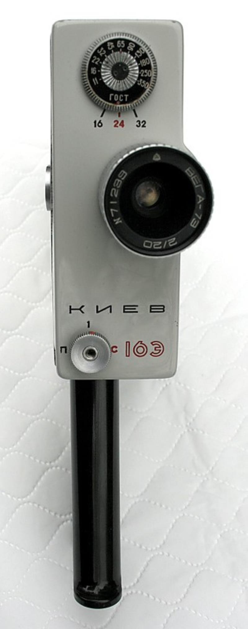 The Kiev 16 E is a 16 mm movie camera with electric motor drive(E stands for ELECTRIC). It has three filming speeds of 16, 24 and 32 frames per second, plus single frame. The removable 'C' mount lens is a Vega-7E(or may be Vega-73?) f/2.0 20 mm. TTL metering via a CdS cell can be set from 11 to 350 GOST.