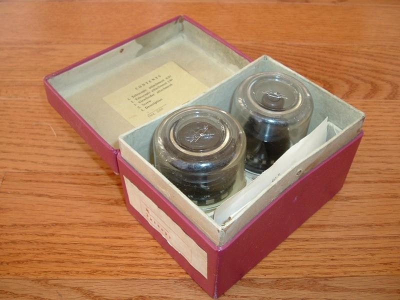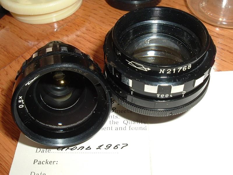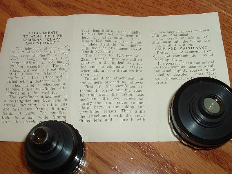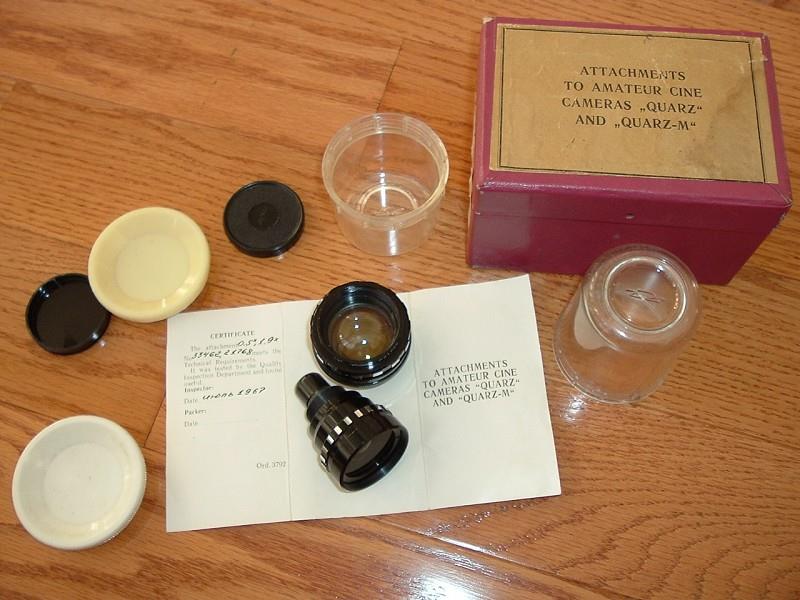 Set included telescopic 1.9x and wide angle 0.5x accelerary lenses and viewfinder (missing from the set) for movie cameras Quarz and Quarz-M. Made by KMZ.