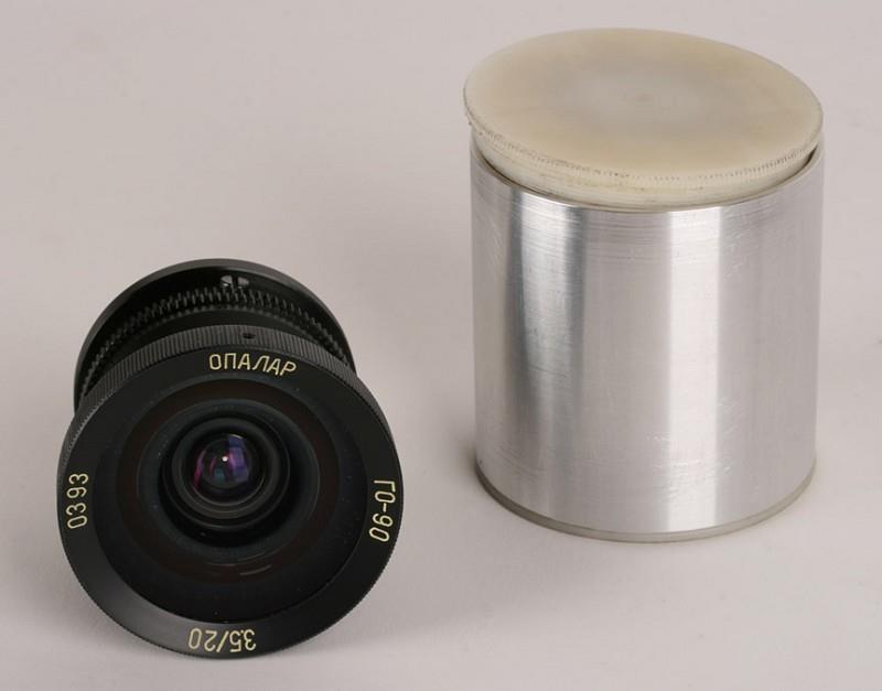 This lens is an improved version of the "Hydro Russar" lens, for underwater use. There is no focusing ring as depth of field is so great. The front of the lens is covered with a blue-coated protective disk of glass, mounted as to be water-tight. Front and back elements are coated with a purple coating.