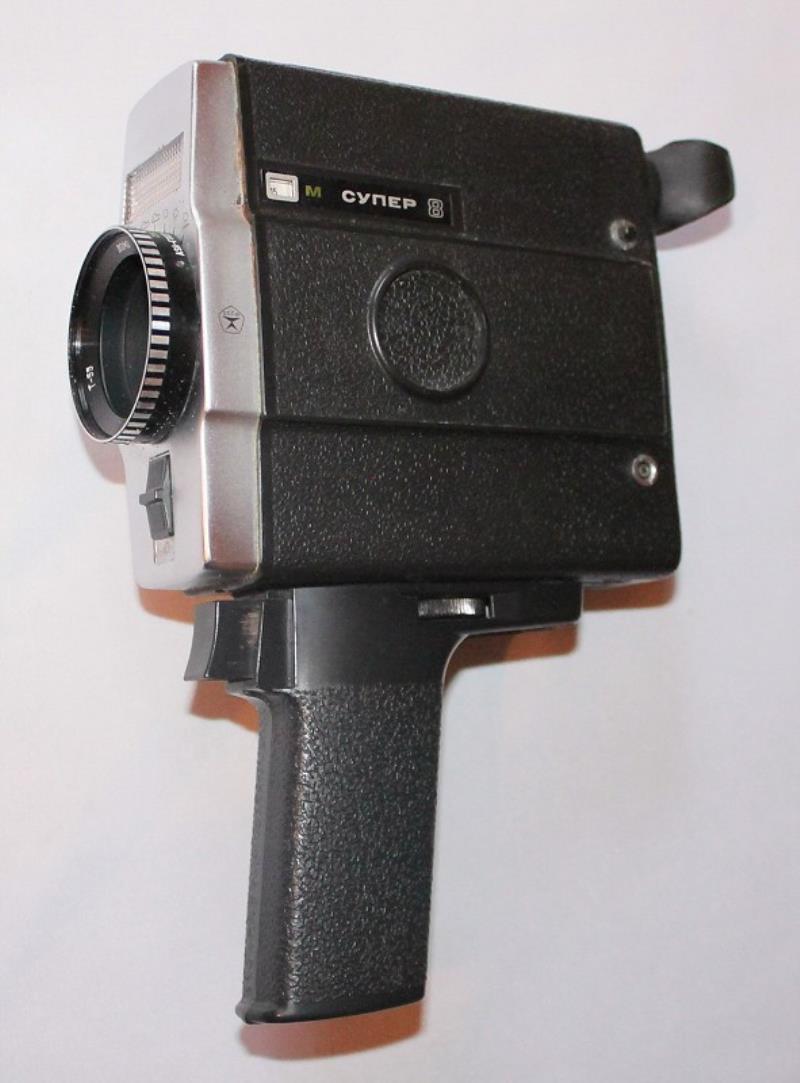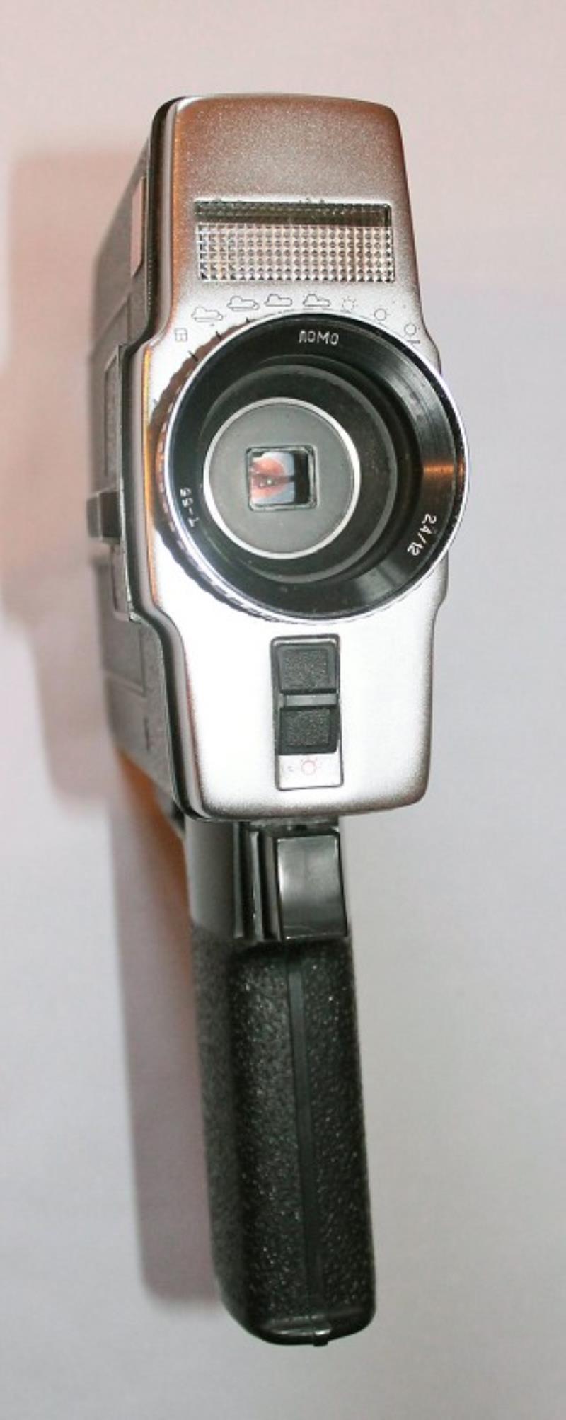 The Avrora 217 takes super-8 film cartridges. Electric motor drive. Lens: T-55 f/2.4 12mm. Diaphragm scale in viewfinder. 18 fps.