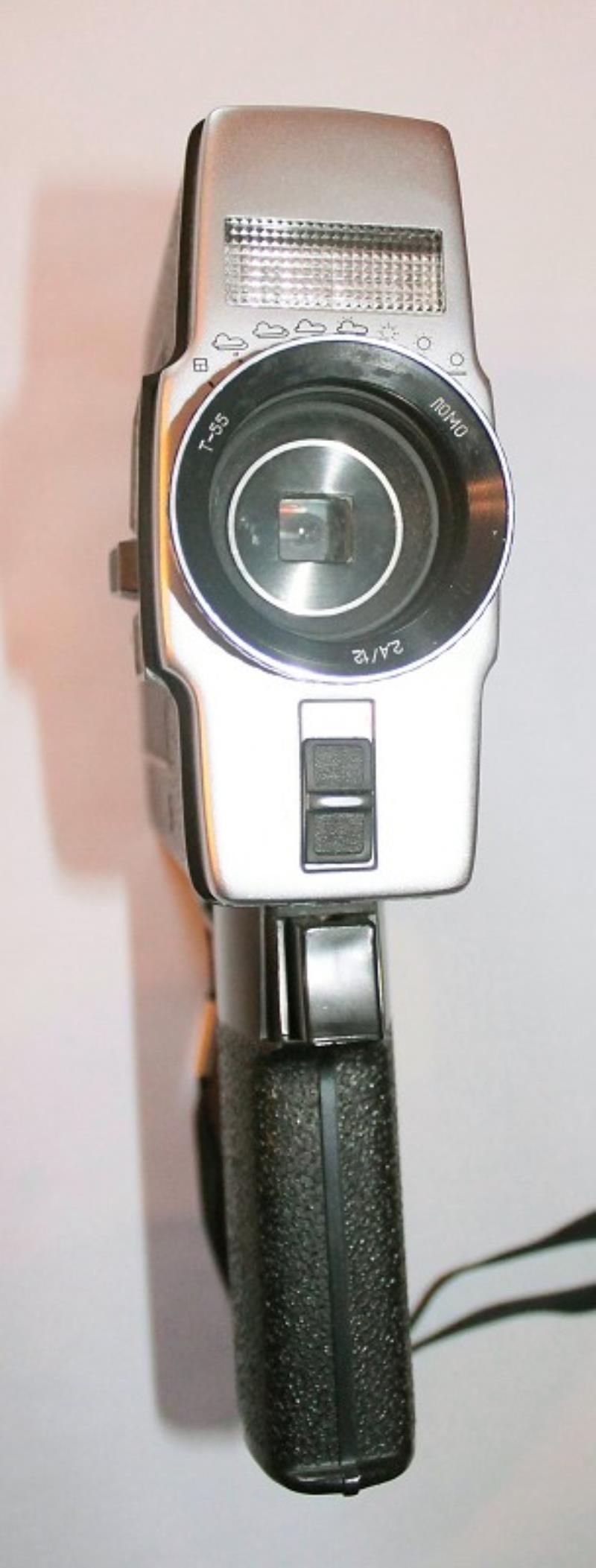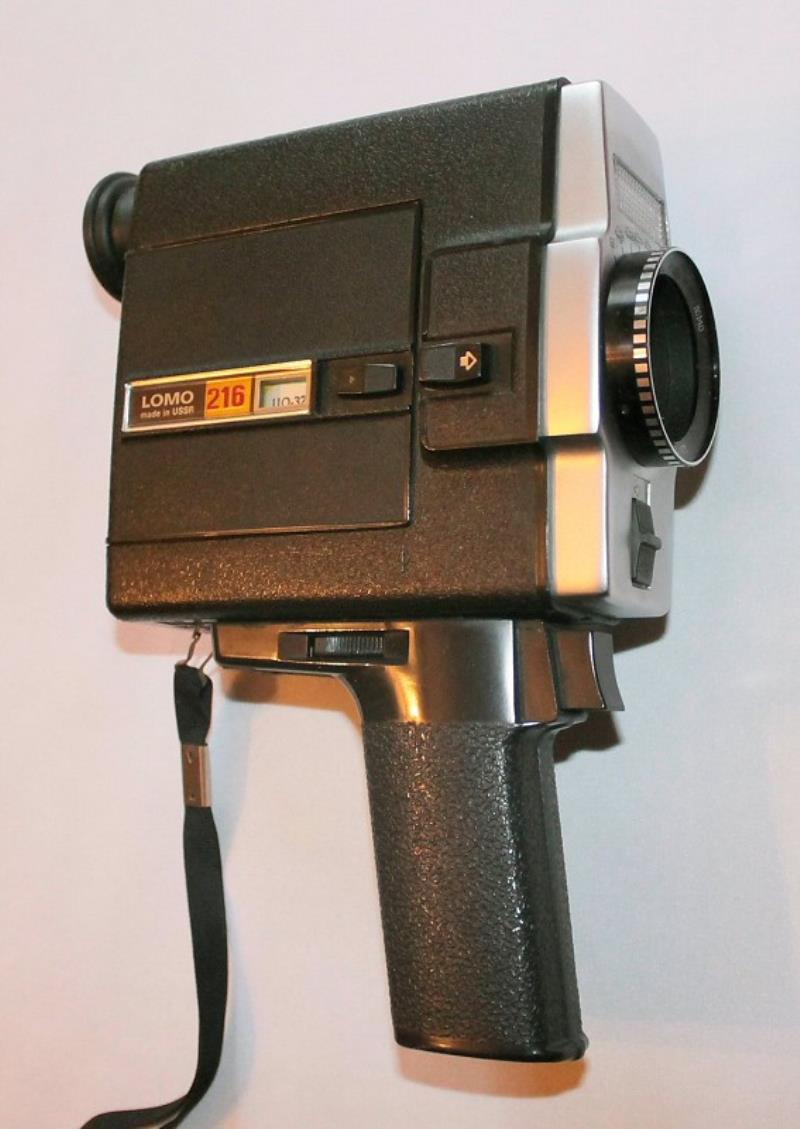 The LOMO 216 takes super-8 film cartridges. Electric motor drive. Lens: T-55 f/2.4 12mm. Diaphragm scale in viewfinder. 18 fps.