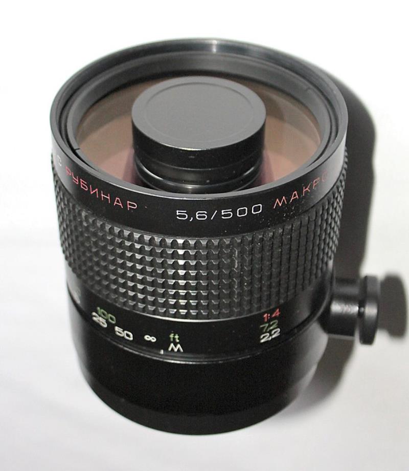 The Rubinar 5.6/500 Macro was manufactured by LZOS and has a 42mm screw lens mount for Zenit cameras. It focuses down to 2.2 metres. The fitted case includes a lens hood and filters.