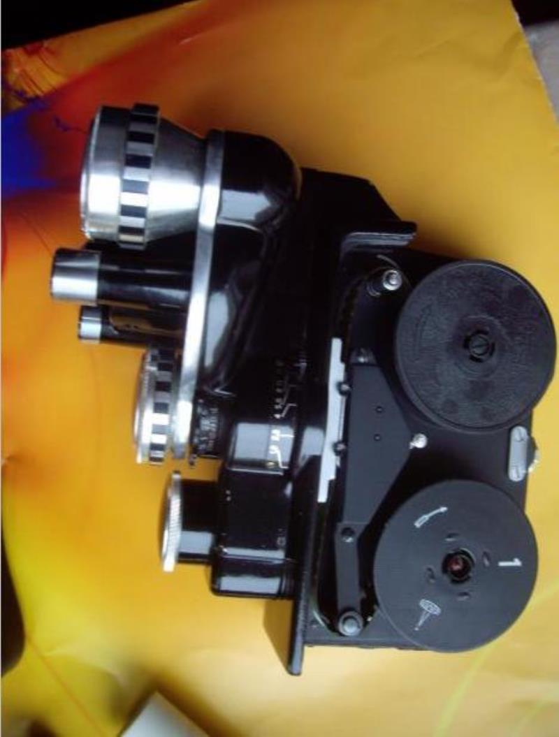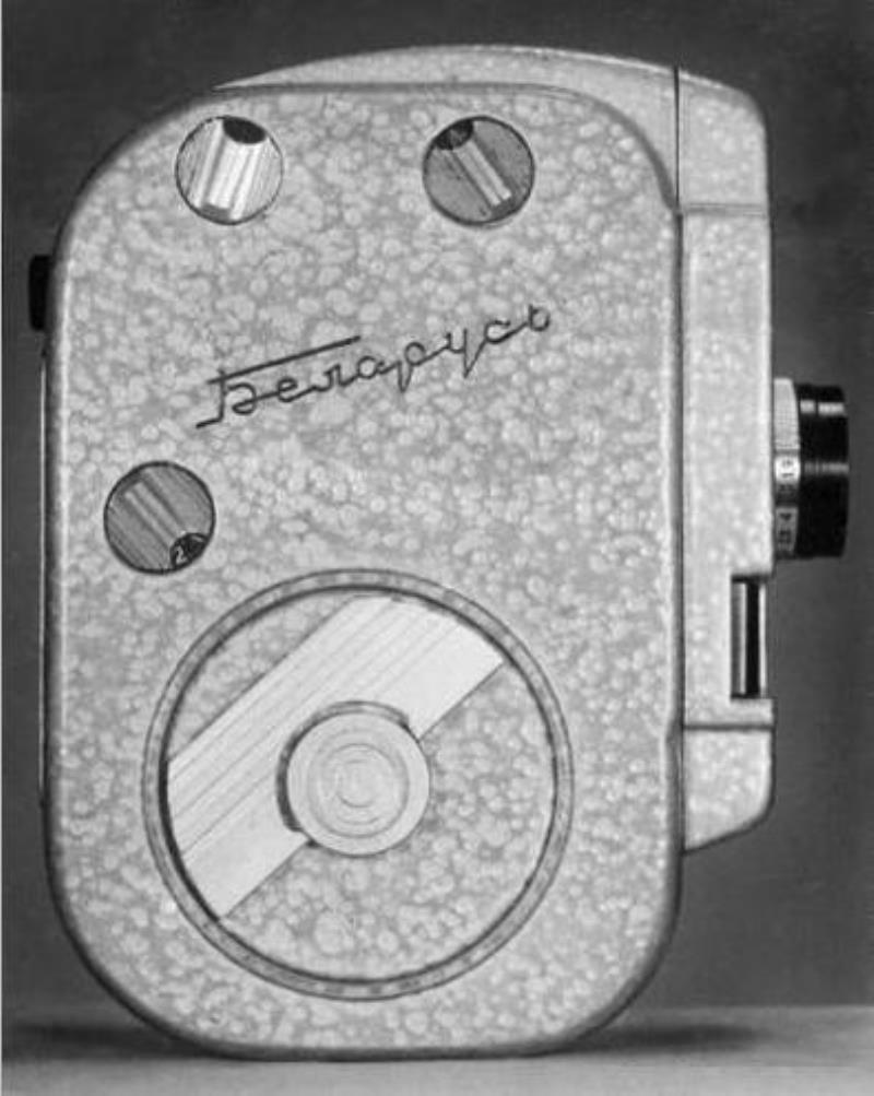 Experimental 2Х8мм câmera "Беларусь"(Belarus) made in 1959, produced at БЕЛОМО, with ЛОМО technicians. Small series. No commercial production. Objective "Нева-1" (Neva) 1:1,9 F-12mm. This camera was the forerunner of the Neva original 8mm produced by ЛОМО see: NEVA movie camera entries. The same mechanics was used in KAMA and EKRAN Cameras from Kazan (see entries)