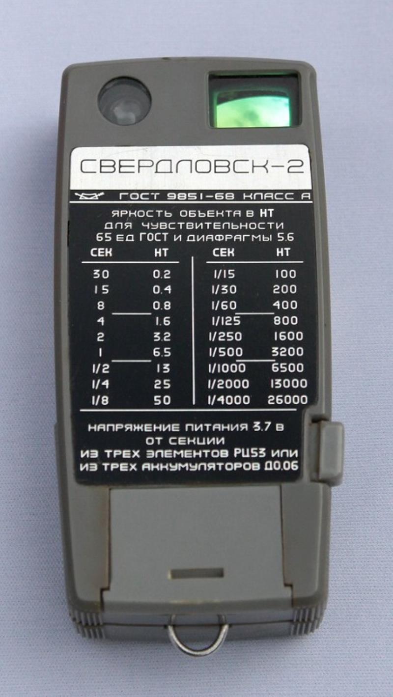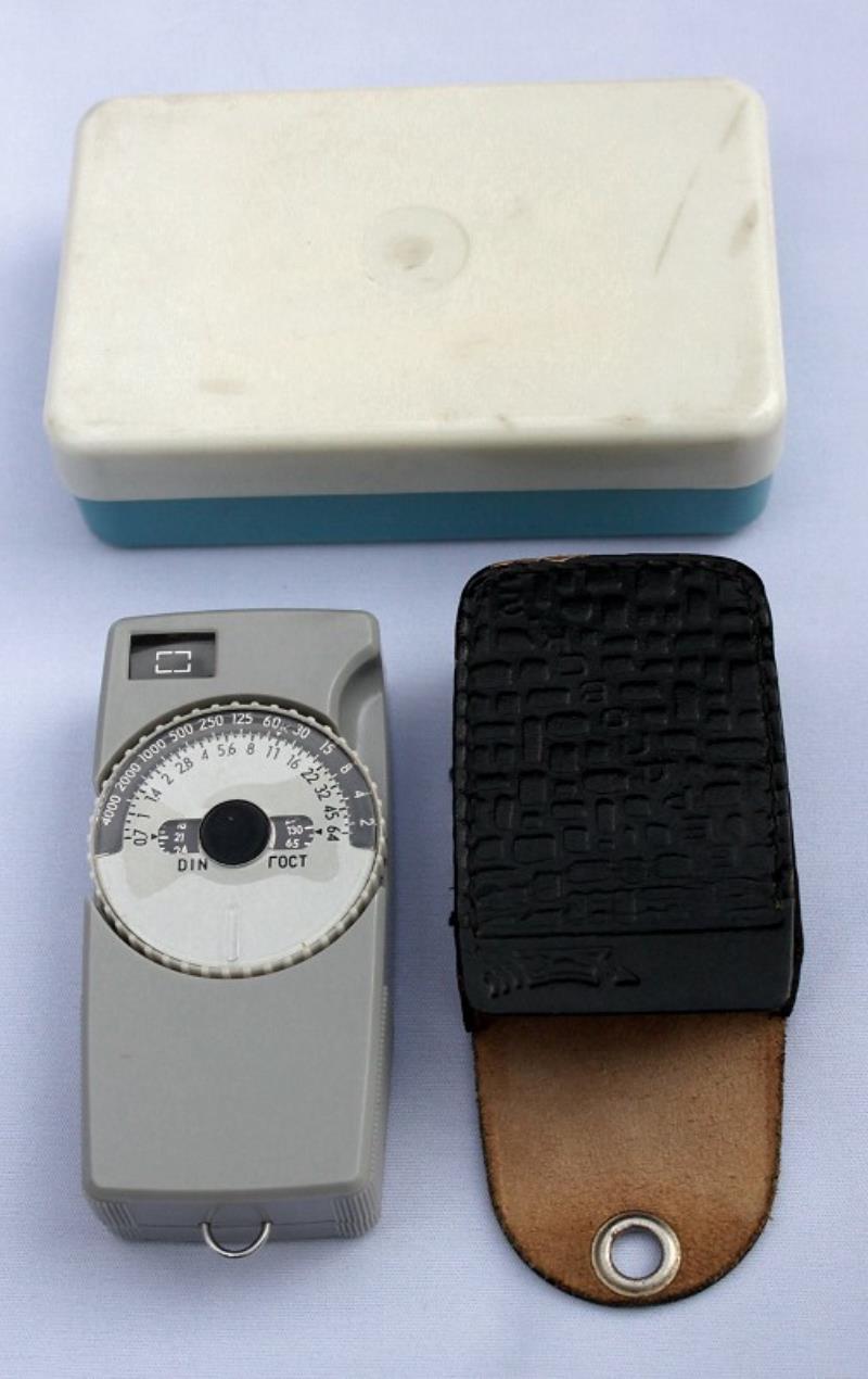 The first two photos show the first version of the Sverdolvsk-2 exposure meter. The second version in photos 3 & 4 has the addition of a battery check button on the front of the meter. The Svedlovsk-2 has a viewfinder to align the meter with the subject and a red LED to indicate the correct exposure settings. Film speeds in the range 1 to 2000 GOST (3 to 36 DIN) can be set and exposures from 30 minutes to 1/4000 second can be calculated. The meter uses 3 x 625 button cells. Manufactured in the 1970s.