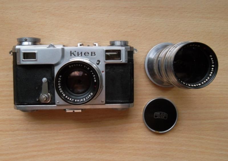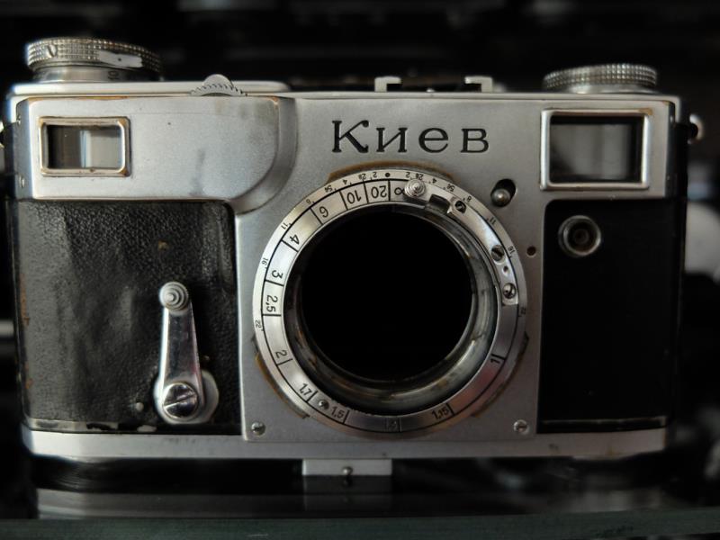 These cameras were assembled most probably prior the official production of Kiev cameras in Jena in 1947. They are assembled completely from Dresden Contaxes and do not have any Zeiss serial numbers. The front plate with the bold Kiev logo was made in Jena. The leatherette on the back door was replaced in order to remove Zeiss Ikon logo. So far it is known about the existence of two such cameras. One has no serial numbers at all, the shutter housing has scratched number 13. Another has the engraved Arsenal serial number that dates the camera by 1953. However this engraving was done above the Contax shoe. It is possible that the crate with this batch of early cameras was discovered at the factory warehous and it was decided to sell them as regular Kievs. The scratched number on the shutter housing was removed by brushing.