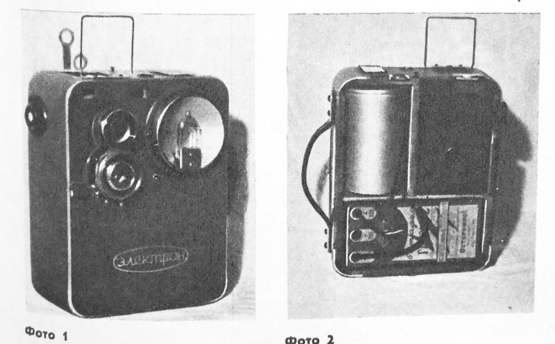 Pictured in the photograph device to photograph - "Electron" - consists of a device TLR"Lubitel-2" and the electronic flash "Ogonyok". A distinctive feature of the device is that camera, electronic flash, and power to it are mounted in a single unit.