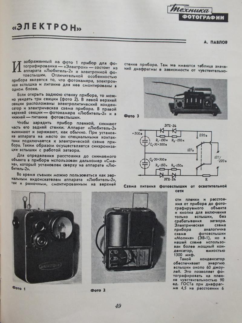 During the photo shoot can be used as a mirror viewfinder apparatus "Lubitel-2" and the framework mounted on top the unit. There are table aperture, depending on the sensitivity of the film, and the distance from the instrument to the object being photographed and the button to turn on the flash only, without shutter. Schematic diagram of the device is similar to the scheme flash "Molniya" (EV-1), but in our scheme to use more powerful condenser capacity of 1300 microfarads.Device size 170 X 220 X 80 mm. Weight battery of about 2 kg.