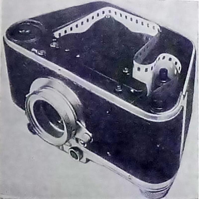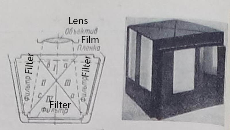 The idea was to capture light via lens and use a prism to evenly distribute the picture onto three frames, where each frame is located behind a color component filter (yellow, blue and green). A combination of the three black and white images via a special projector would result in a color image. The solution in this camera consists of a complex prism system made up from four prisms and glued together into a cube that is very similar to the one used by “Technicolor” system.