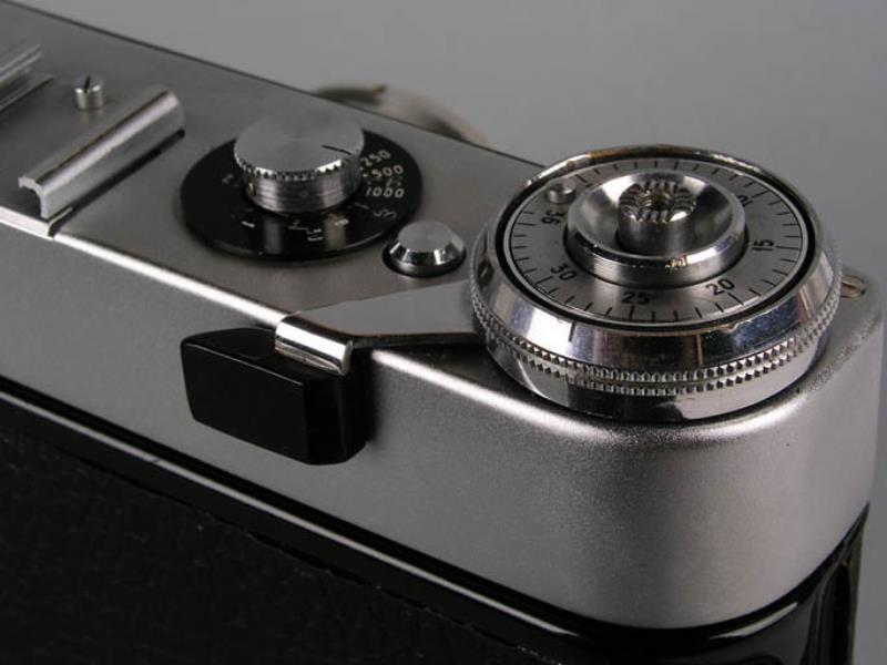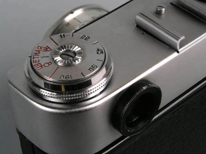 If you look at the top view of the camera, you can see traces of the cut in the top plate where the reflex housing was removed (from a Zenit-E), and then replaced with a flat section (then chromed over). The shutter speed plate appears to be from a Droog, the rewind knob from a Zenit-B, and the body trim from a Zorki-6. The faux leather body covering is the same as that used on the Zenit-7 from 1969.