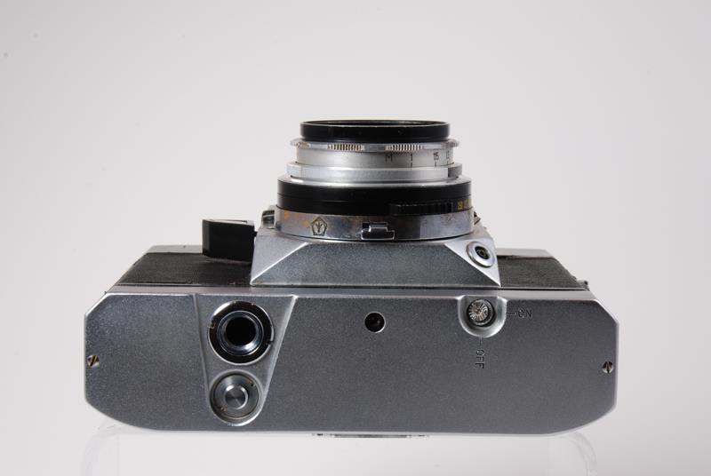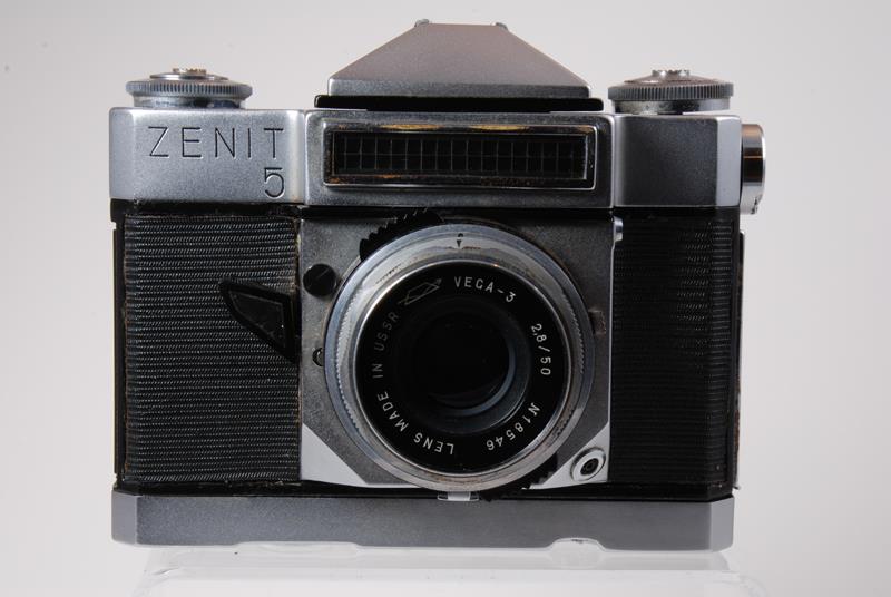 The Zenit-5 is a modification of the Zenit-4 with a built in motor drive and rechargeable batteries. It is labeled "Zenit-5". The base plate of the camera is a little higher to make space for the batteries and there is a jack in the baseplate for the recharger. Because the camera was motor driven it did not have a film wind lever, however the film reminder knob was attached to function as an emergency film advance. There are no differences other than these. These cameras will normally be found with the batteries removed because they leaked. It is not uncommon to find that all the connections for the batteries have been removed. Compatible with the Voigtlander Bessamatic lenses