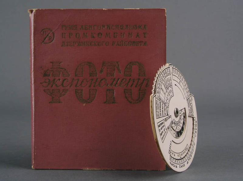 The back is impressed with Cyrillic writing relating to the original price of the booklet. Inside, in a pocket, resides a round adjustable exposure calculating device whose wheels are actual photographs, contact printed onto silver-gelatin emulsion coated photographic paper. There may have also been a paper table in the opposite inside pocket, now missing. The booklet is hand-made and although very popular and numerous at the time they were used, few have survived, having been discarded after the widespread use of selenium and electronic mechanical light meters.