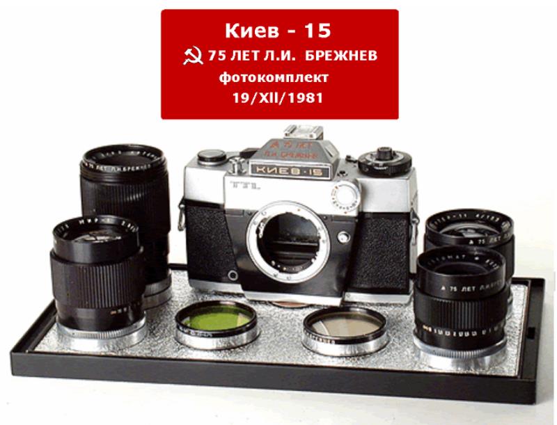 - Kiev-15 TTL Nº. 8003308 "Gift Camera" - Single lens reflex outfit. Kiev 15 TTL camera 24x36 mm, with Mir-1 Avtomat 2,8/37 mm Nº. 8003308, Helios-81 Avtomat 2/53 mm Nr. 8003308, Jupiter-9 Avtomat 2/85 mm Nº. 8003308, Jupiter-11 Avtomat 4/135 mm Nº. 8003308 and 2 color screw filters. All items are attached in a styled plate. Each item has the same serial number, in which are engraved the hammer and sickle and L. I. Brezhnev 75 years (Leonid Ilych Brezhnev 1906-1982, leader of Soviet Union 1964-1982). Origin: According to our sources this outfit was made as a gift to the former USSR head of state for his 75th birthday; Dec. 19th 1981, and was planned to be given to him at his visit to the Arsenal factory in Kiev at the same date (Leonid Ilych Brezhnev was born in Ukraine). The visit never occurred and Brezhnev became sick and died in the following year. The gift was kept at the factory. During the demise of the Soviet regime this outfit disappeared from the Arsenal factory and was further sold in an auction in May 2002 by a Russian collector.
