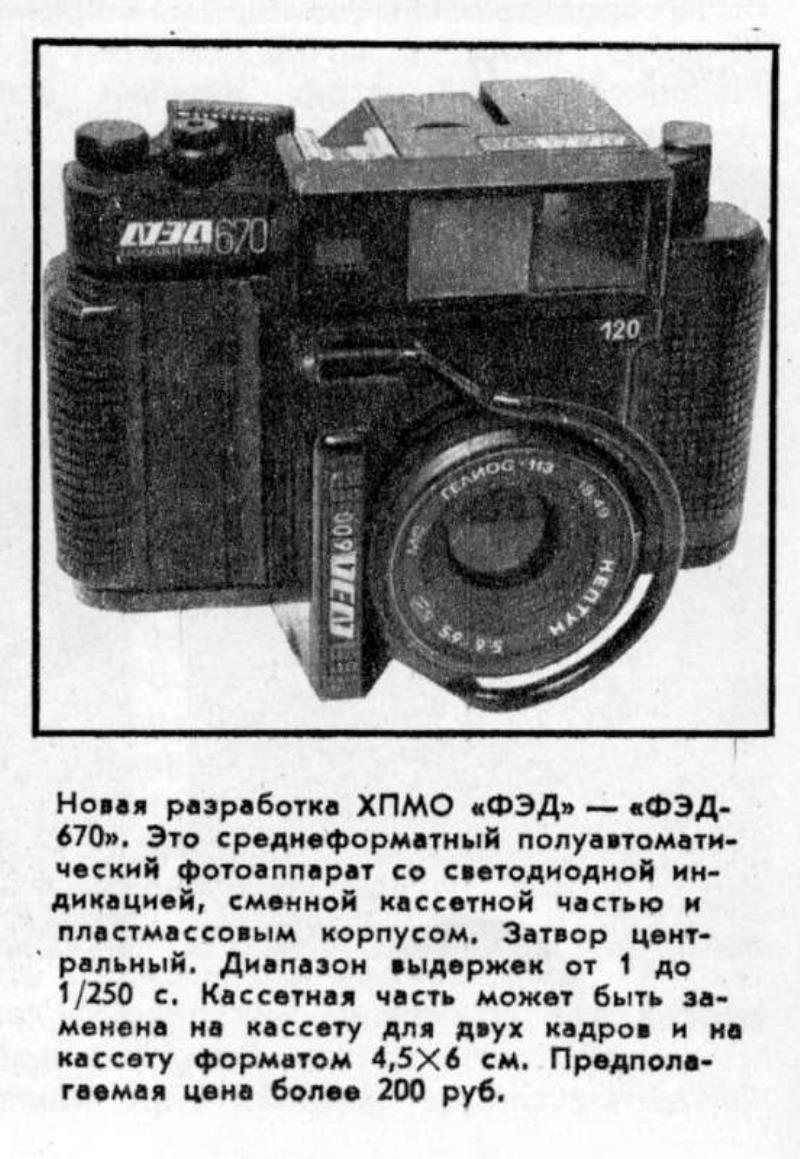 From Sovietskoe Foto October 1995: “New product from “FED” “FED 670” Medium format semi automatic camera with light emitting diode , changeable magazine and plastic body construction. Between the lens shutter; time scales from 1 to 1/250 sec. Magazine can be changed to 6x7 format and for 4,5x6. expected price above 200 rub.” Lens: MC Helios 113 f5.6 65mm Neptun "FED 600" on front panel.