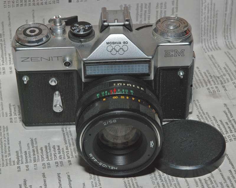 This camera adds lens aperture automation to the Zenit-E. There are several other minor cosmetic changes but only this major change. At least 18 versions of Zenit-EM camera existing. The camera can be found marked Cosmorex with a Cosmogon lens and Kalimar also sold a version of this camera marked "Kalimar SR 300". Cambridge Camera also produced one of these with a Cambron plate [2].