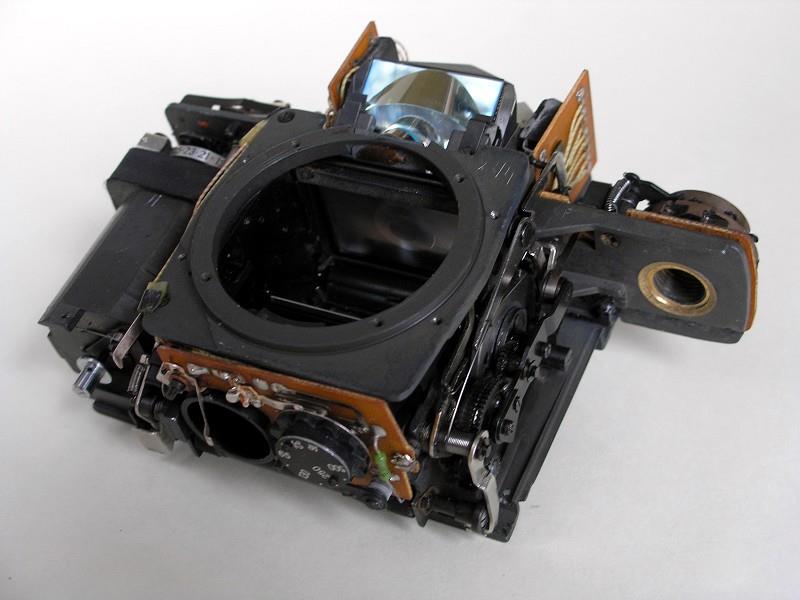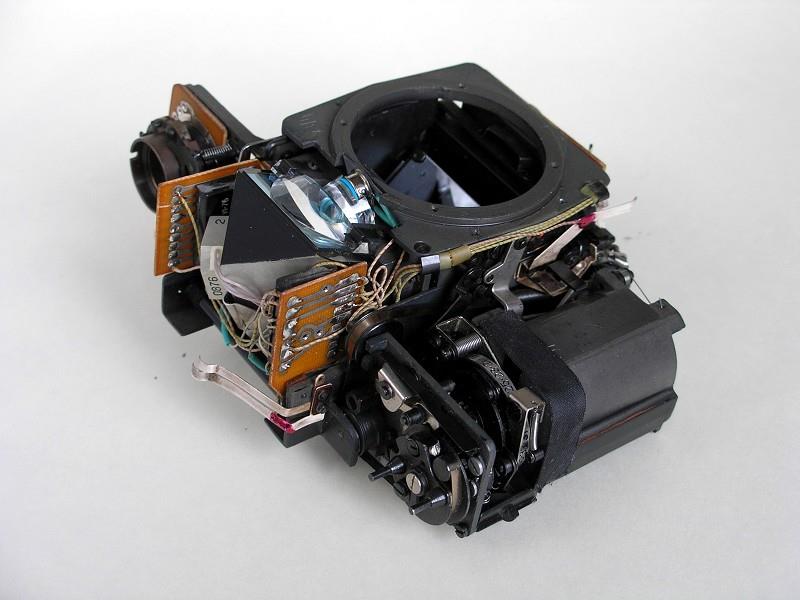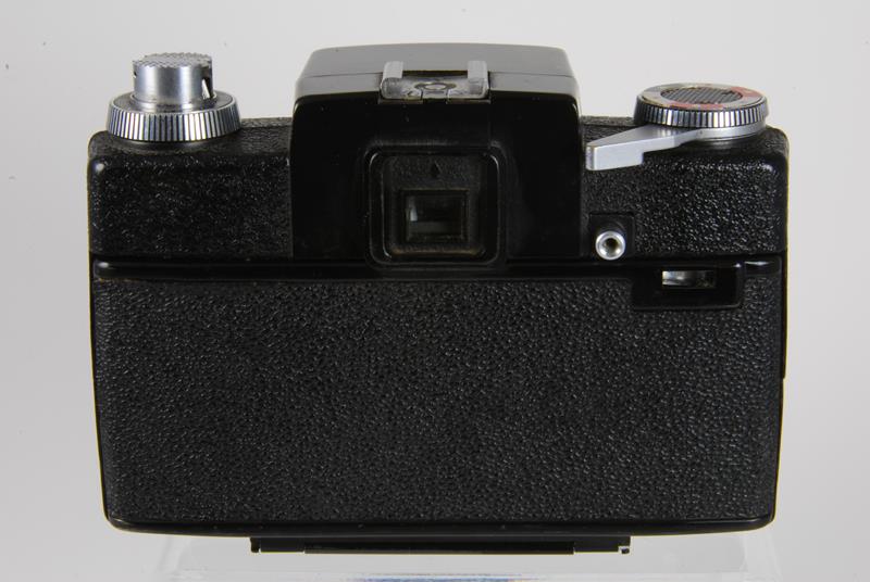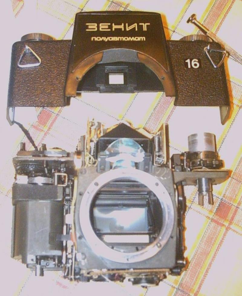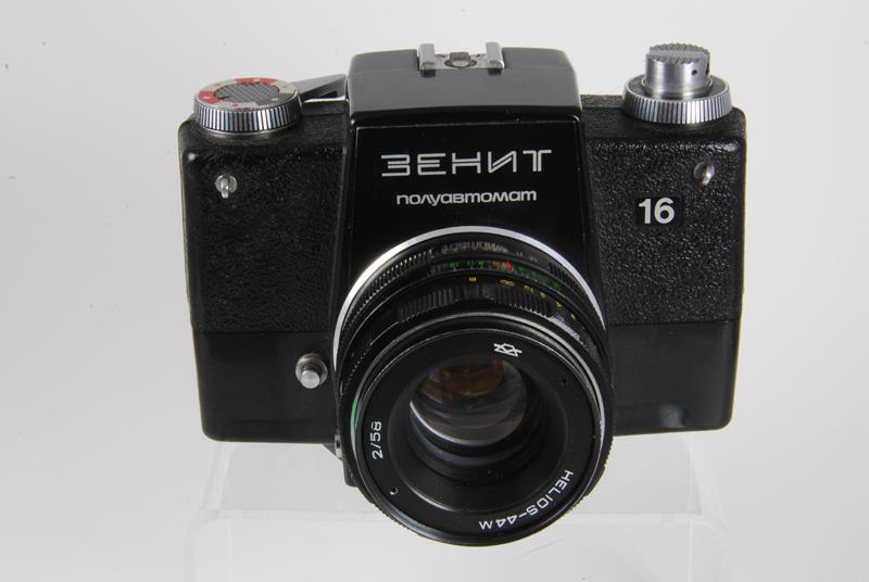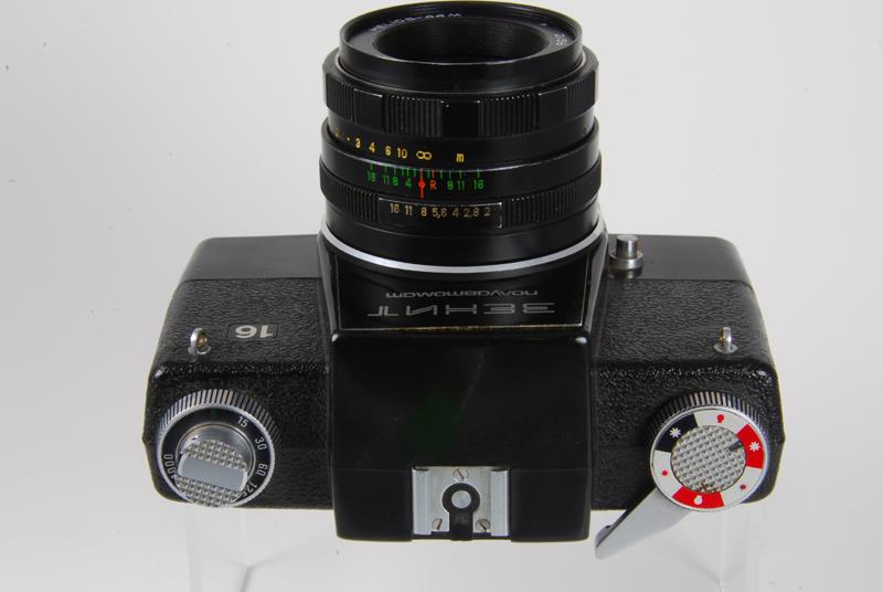 The Zenit-16 is a very uncommon camera. The body is made completely of plastic with the upper portion pebbled. The only control on the front is the depth of field preview on the lower right next to the lens mount. Just below this on the side of the lens mount is the flash receptacle. On the top left deck is the shutter speed dial with the rewind crank in the middle. The shutter is an electronically timed horizontally traveling cloth focal plane shutter. Centered in the flat prism housing is a hot shoe. On the right deck is the film advance with a film reminder in the center. The shutter release is just to the right of the prism and is threaded for a cable release. The view finder window slides up to release the back which is hinged on the bottom. The frame counter is a small rectangular window in the back just to the right of the shutter release (source: http://www.commiecameras.com).