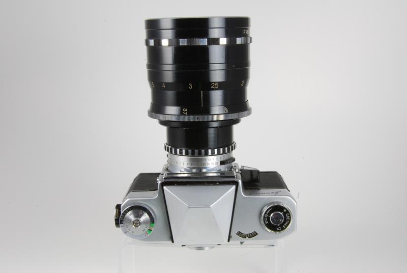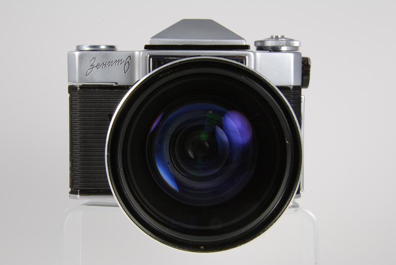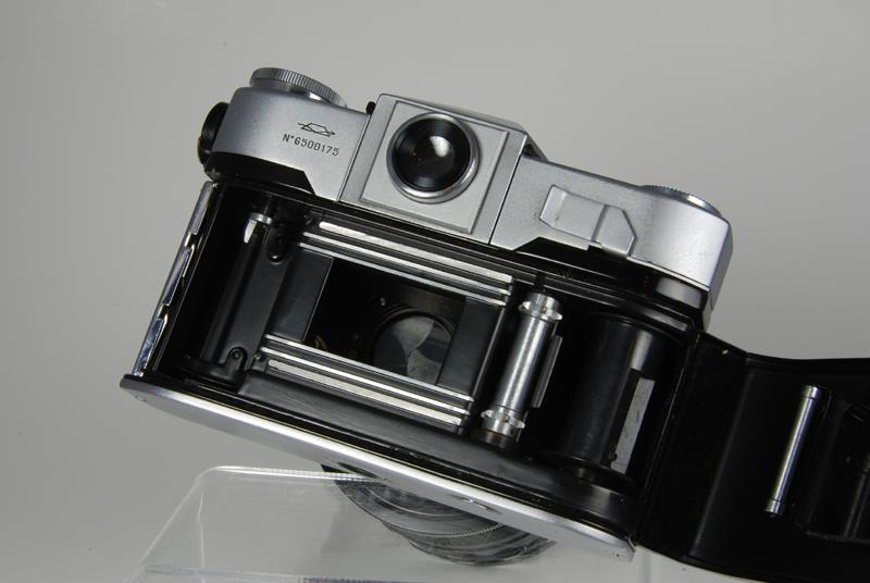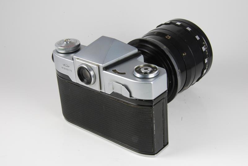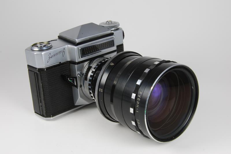 The only differences between this camera and the Zenit-4 are the labeling and the standard lens. The Rubin-1 zoom lens was available as an accessory for the Zenit-4 but standard on the Zenit-6. The Zenit-6 came in a large black leather case which had no markings. The camera fit in the case with the lens down. The case had a compartment on each side for accessories. There were a yellow and an orange filter, a cable release, a lens cap, an accessory shoe and a waist level finder provided as standard accessories. Voigtlander Bessamatic lense are compatible.