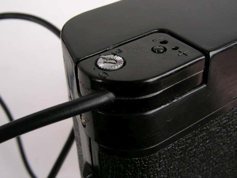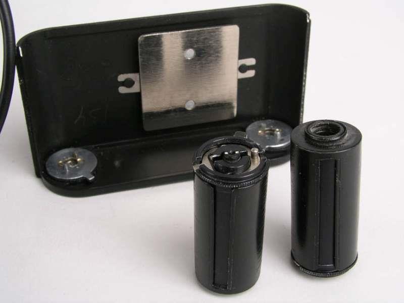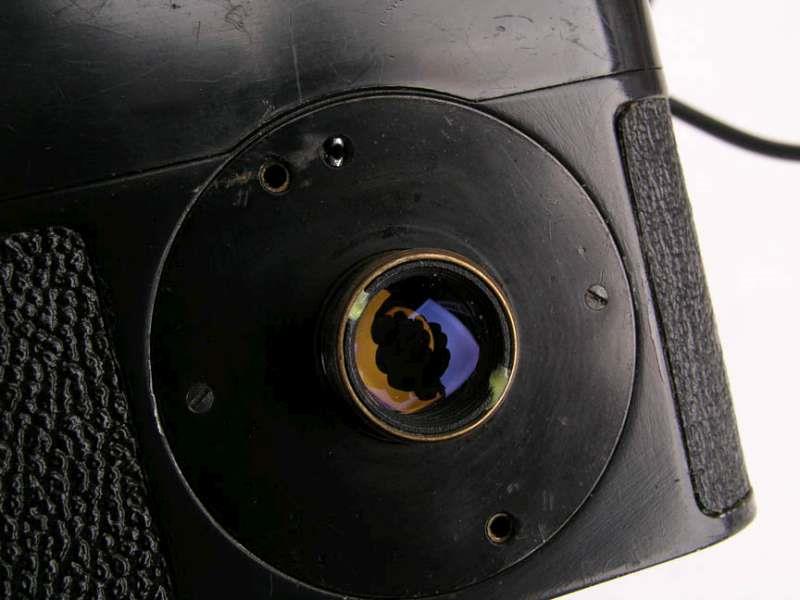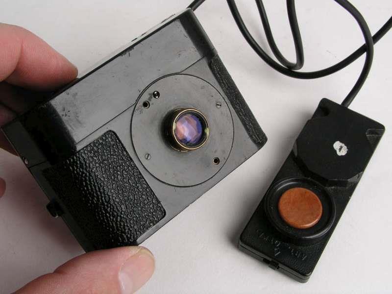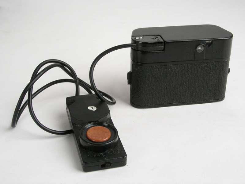 The camera has no viewfinder and is meant to be used with disguise devices: hidden in handbags, behind coat buttons, in movie cameras, etc. It has a wire cord ending in a remote with a bakelite button which can be set to automatic or single frame. The rechargeable batteries are located in this remote.