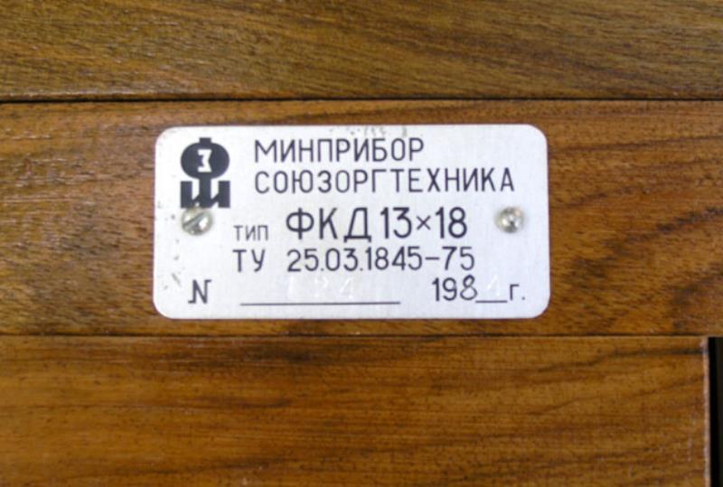 This parcticular FKD 13x18 camera was made in Kharkov, Ukraine, in 1984. It comes with lens, lensboard, 2 double-sided cassettes, original case and passport. . (fedka.com)