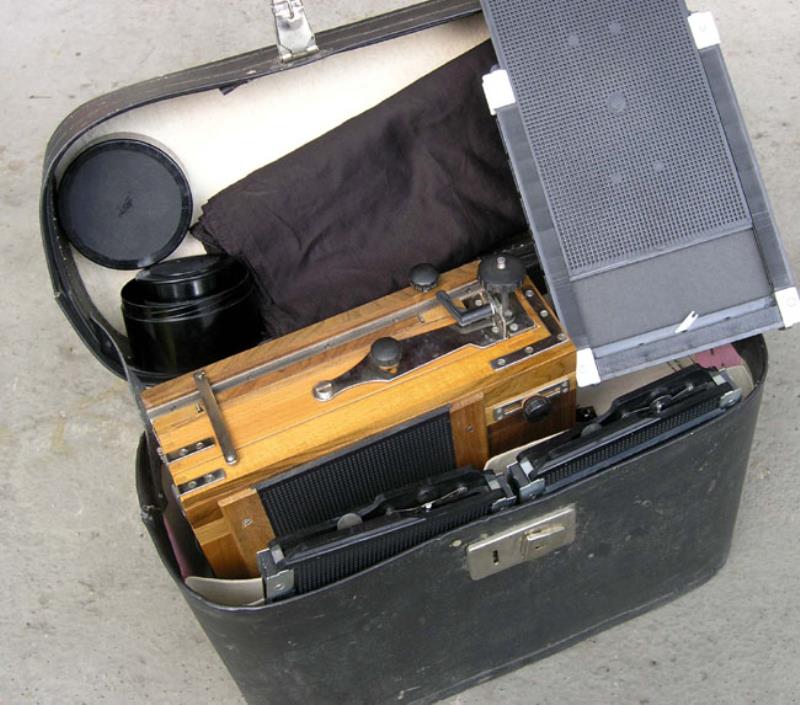 The lens is Industar-51, 210mm f:4.5. There is no shutter, the exposure is dony by replacing the lenscap (nice and heavy, with velvet lining). The cameras used glass plates, but later switched to sheet film. I believe the cassttes can be used with both plates and sheets.