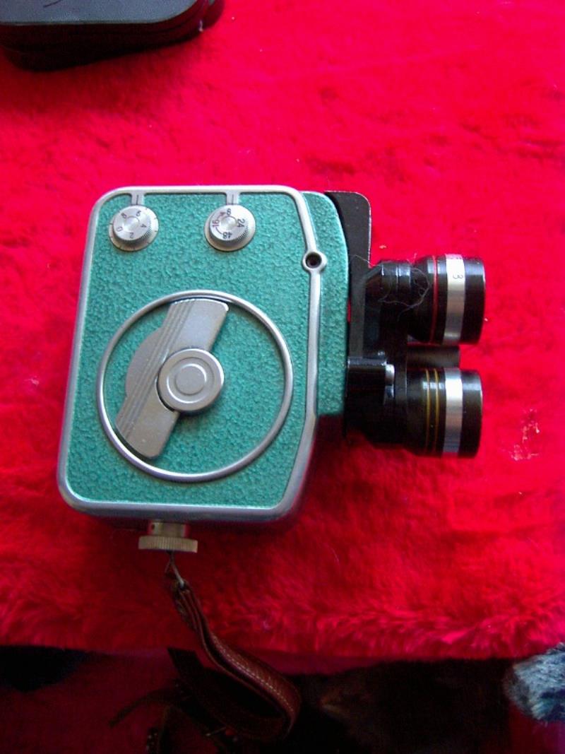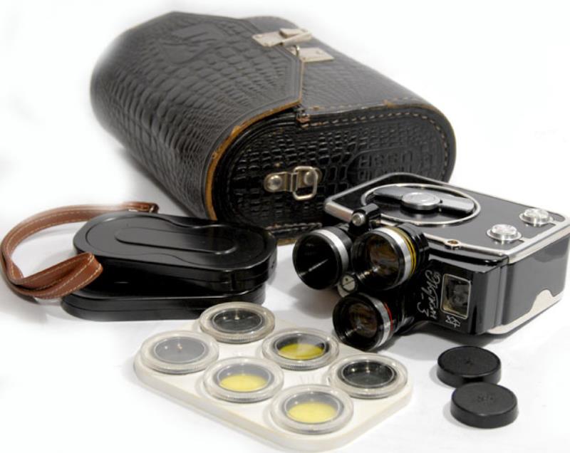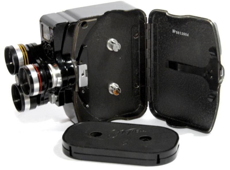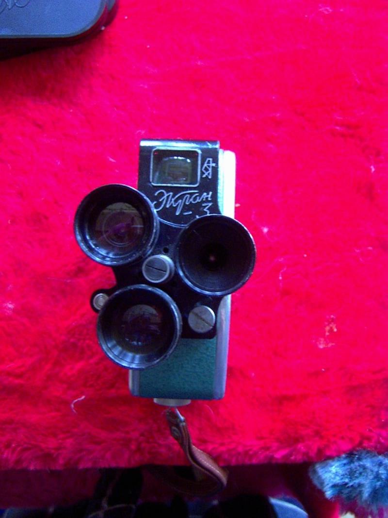 Kazan Factory. Ekran 3 is a continuation and a further development of original Ekran cameras, being them really an accessory than a real new camera. All sharing the same mechanis of the previous Kama cameras. There were no Ekran 2, the 3 number is because the three lens system . This camera is really the same Ekran with the normal fixed focusing Triplet (Triar) 2.8 /12.5mm with a new removable front wth the turret and a colored mask for the finder.. The turret has three tubes: the first one is a single filter with no effect , The other is a 0.7 converter glass and the third a 1.5 converter glass. used togethre with the camera lens gives an equivalent of 8.4mm 12.5 mm and 18mm lens fields. Colored frames can be seen through the view finder matching the colored rings of the auxiliary lenses. A funny and Clever idea