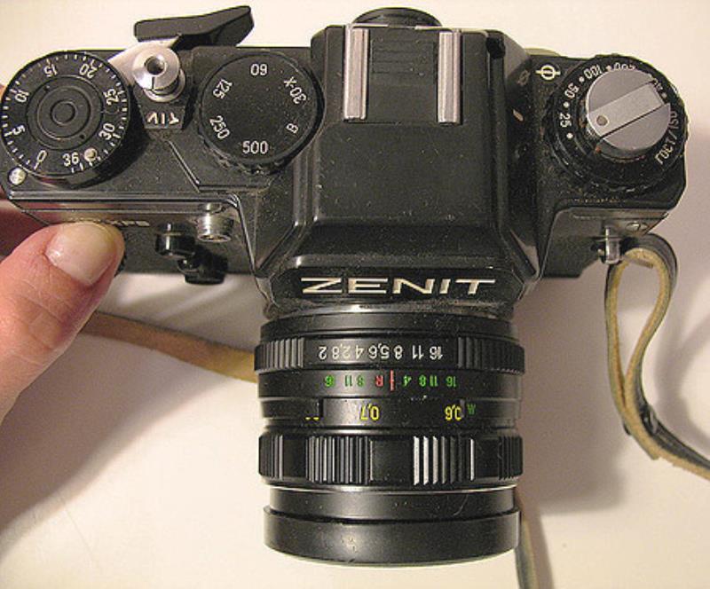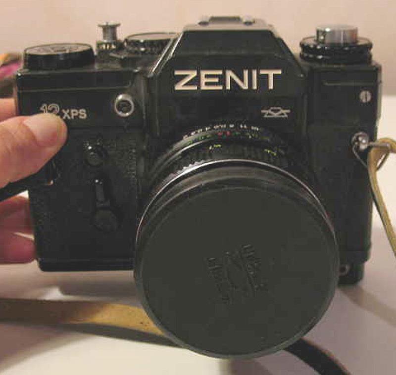 Another version of Zenit-12xp, but modified for use in Fotosiper kit. Taller upper part = lower shutter speed knob, meter adjustment in cavity next to flash shoe. Longer ocular. Base has plug for electrical lens aperture data control.