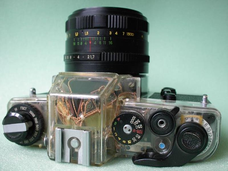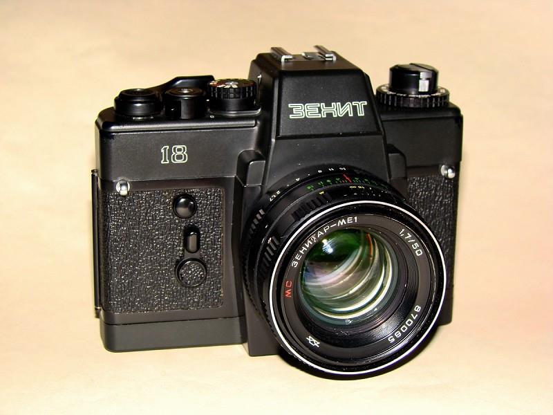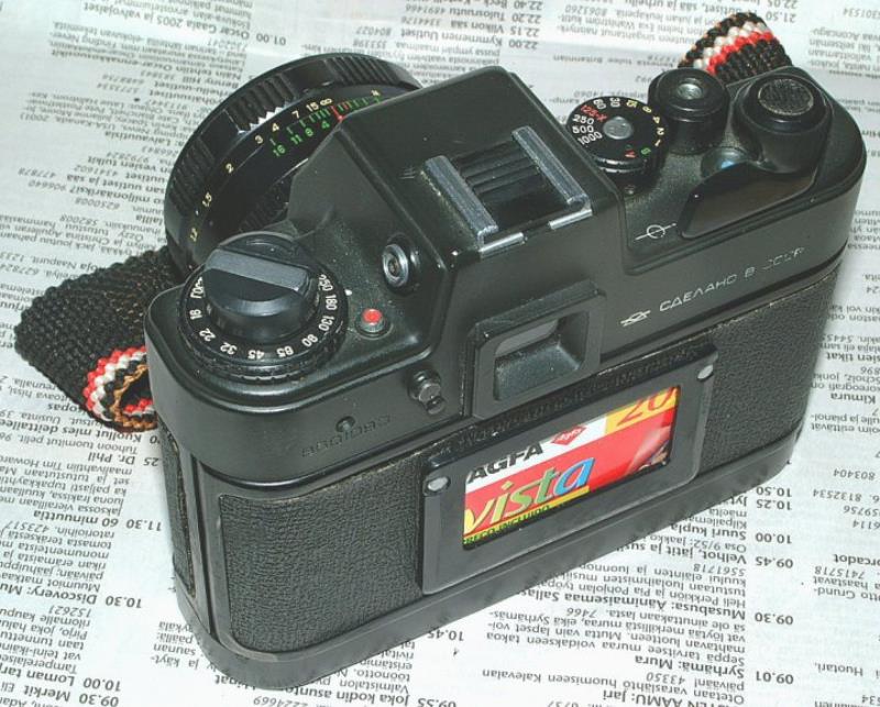 Brother to Zenit-19 but with automatic control of shutter speed. Has full aperture metering, but with special lenses having additional electric contacts. Only Zenitar-ME1 50mm/f:1,7 was made with the contacts. Similar looking system was used in Paktica, but lenses don't match together electronically. No depth of field button, so metering with other lenses than Zenitar-ME1 is clumsy: lens has to be stopped down manually with lens "A/M" button, or only manual & preset lenses can be used. Shutter speeds 1 - 1/1000s.