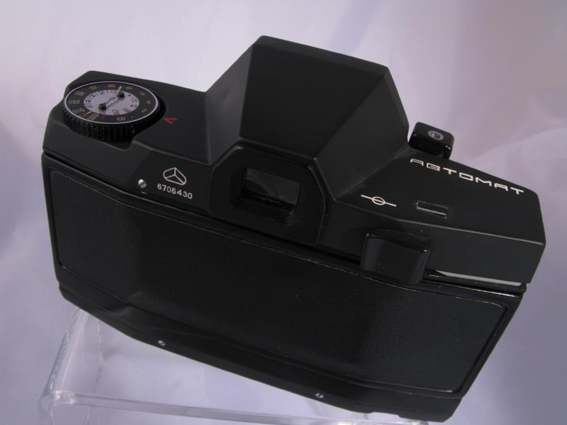 This is an early version of Kiev 10 camera with logo on the front of the body and Helious-65 2/50 Lens. Unfortunately the camera is painted black so until a regular unpainted example is avalaible we will have to do with this one.