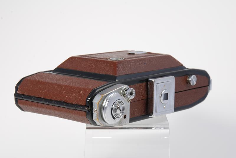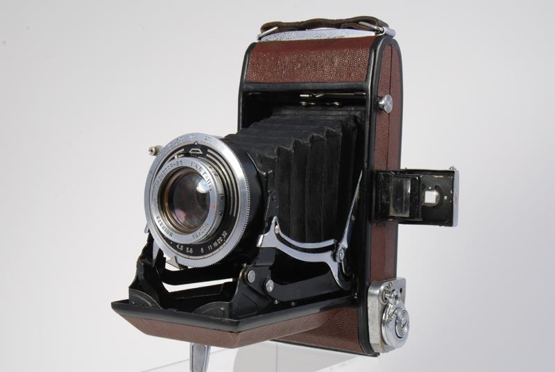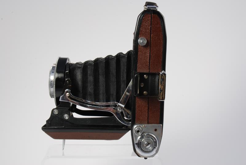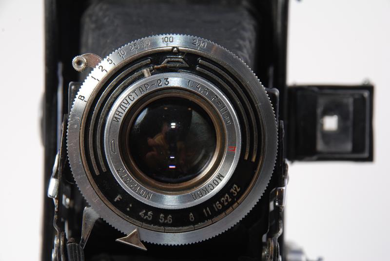 was the first Ikonta type folder made by the KMZ factory. First batches of Moskva-1 were made with Zeiss parts and tools. This model was in production at the KMZ factory for only 3 years, from 1946 to 1949. The camera uses standard 120 film and produces eight 6x9 frames. It features scale focusing, a hinged back door and a double exposure prevention mechanism.