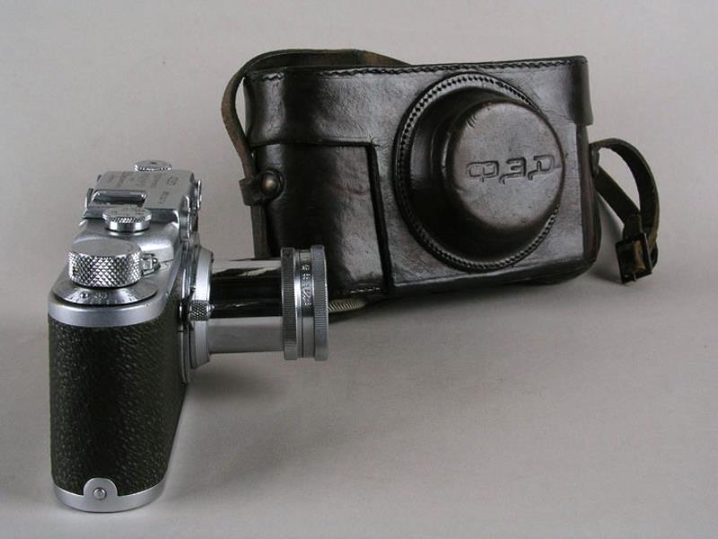 This model of FED-1 was designated "S" by the factory and was made between 1938-1941 according to Princelle. With original leather case, many other accessories were made for the FED-1 during these years, including the right angle viewer, wide angle lens, FED light meter, a panoramic head, and a self-timer with mirror. This was an attempt to make a FED "system camera" similar to what the Leica had evolved into.