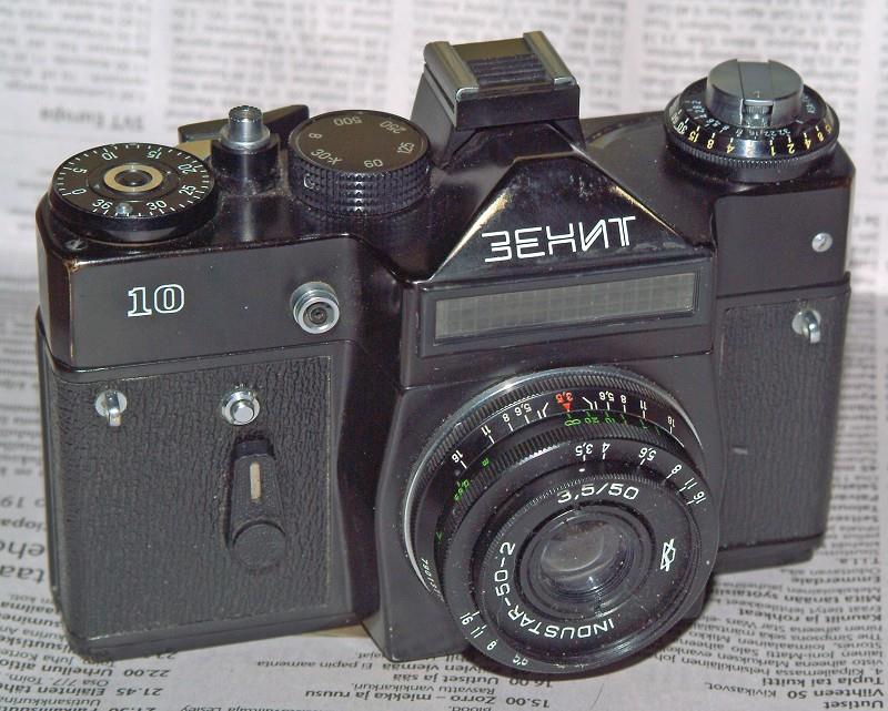 Modernized version of Zenit-E and a link between E and 11. Manual diaphgram, selenium cell exp meter. Film reminder slot in back. Shutter cloth 1/30 - 1/500s. With Helios-44-2 or Industar-50-2 normal lens. List price 137 rubles.