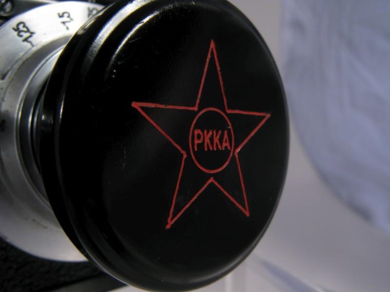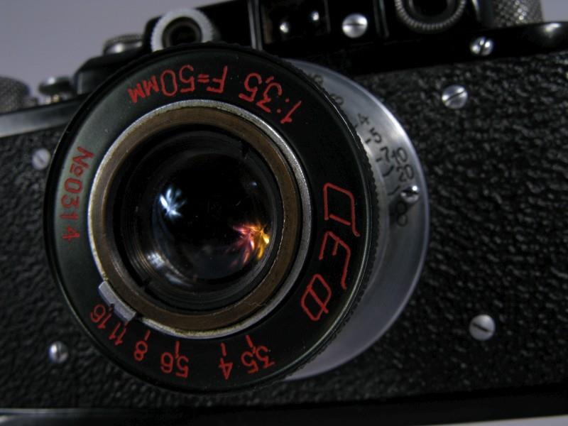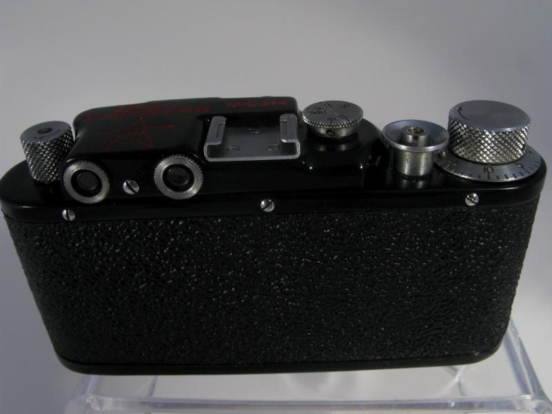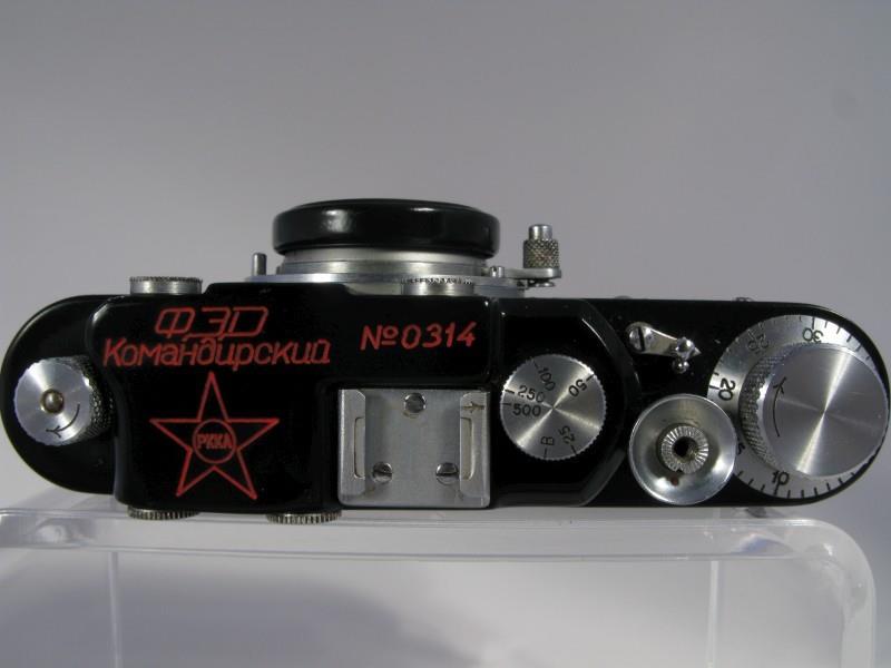 A black painted fantasy version FED with a "Komandirskiy" (Commander's) inscription on top and star with RKKA (РККА - Рабоче-Крестьянская Красная Армия - Worker-Peasant Red Army) writing inside it on both top and the lens cap.