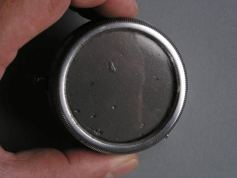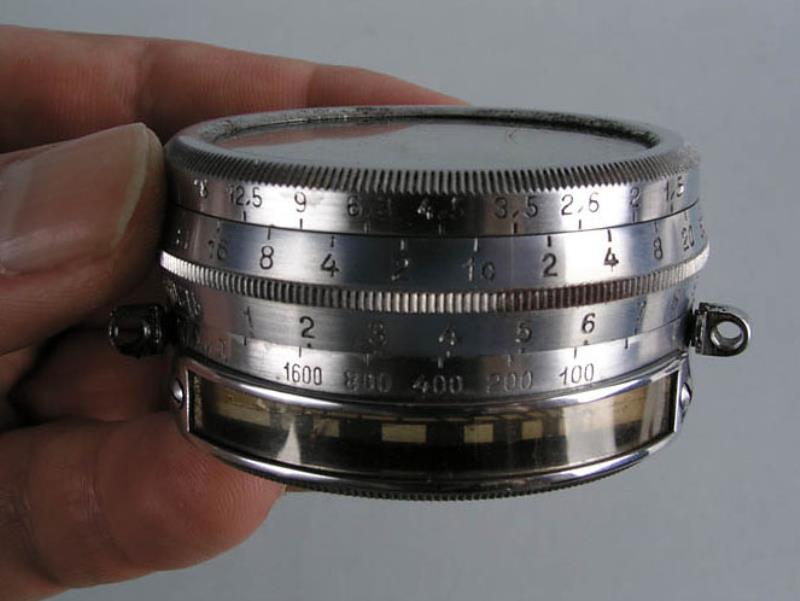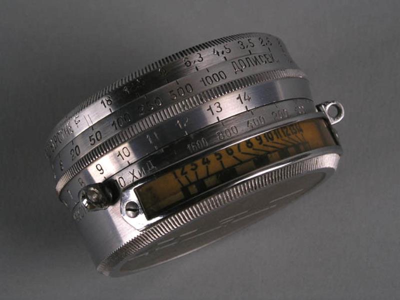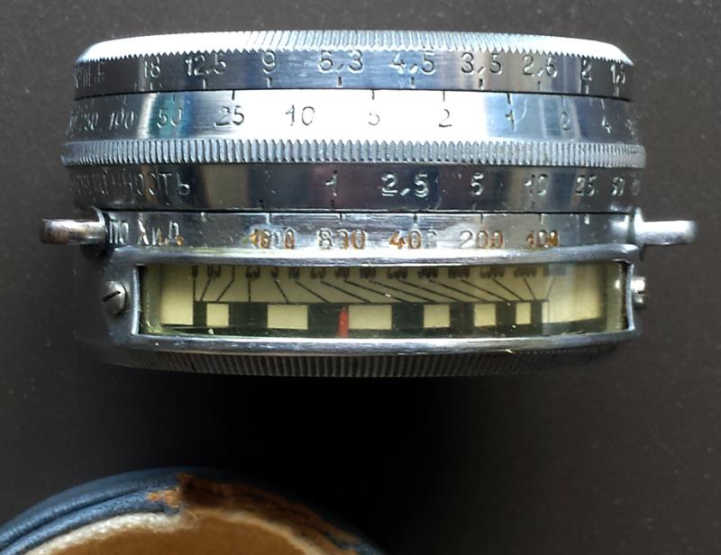 This meter has its factory original, fabric-covered, felt-lined inner box and outer box. The outer box has Cyrillic writing in pen on the inside lid, which reads: "Exposuremeter 1222/300". This light meter was bought during World War II, along with a FED camera, by American photographer, C. L. Sands, and bears his name on the top lid of the outer box. The meter reacts only slightly to strong light due to a worn out selenium cell.