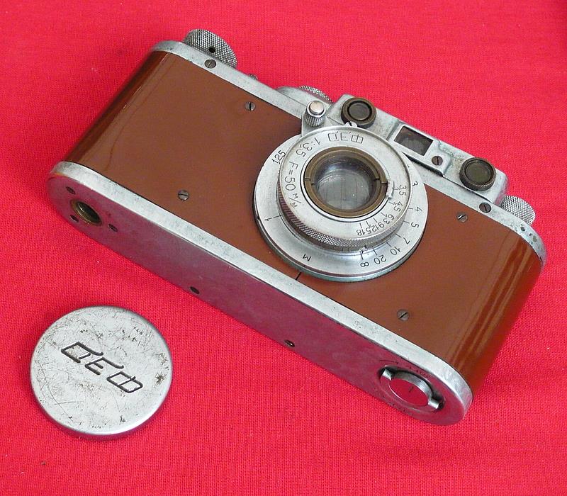 This Fed 1a #968 is the only example known with brown smooth covering, which may or may not be original since there is no documentation at present that brown smooth covering was ever used on early FED 1a cameras. This brown covering is also very shiny. (Please see the smooth black covered example shown in another FED 1a entry).