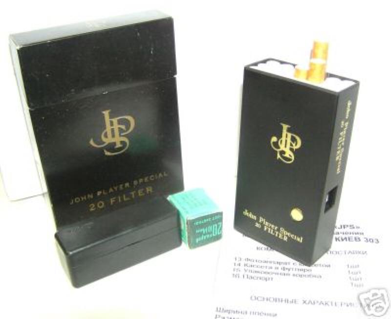 This is a spy outfit for Kiev 303, disguised as a cigarette box. The cameras seems to have been produced in limited quantities in 1980s.