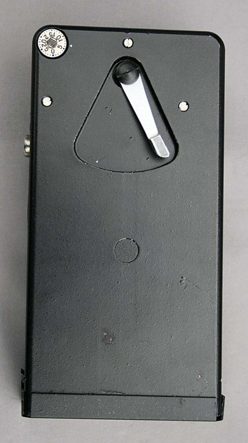 Manufactured by BelOMO, the Kopir uses 21 mm wide film, hence the cutter provided. The frame size is 18 x 24 mm. The lens is an Industar with a focal length of 30 mm and a maximum aperture of f/5.6 (The same lens as the Yolochka). The Kopir uses an internal photo-cell linked to the shutter for automatic exposure times. Film speeds are set by the dial on the front face (1st photo). The lever on the back, advances the film and cocks the shutter. The lamps are powered by three AA (A316) batteries.
