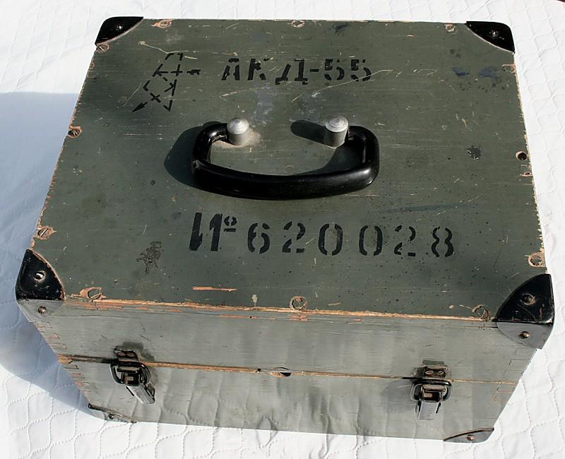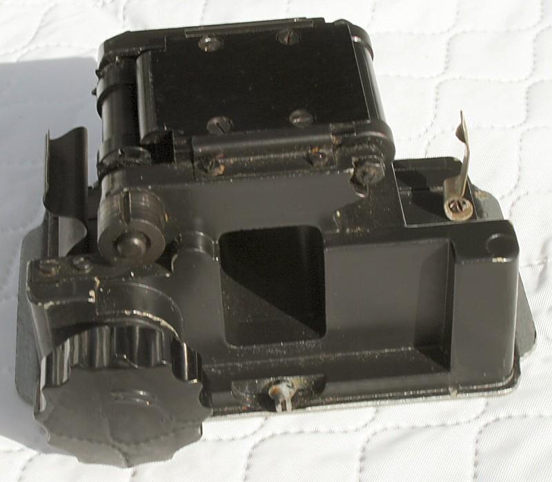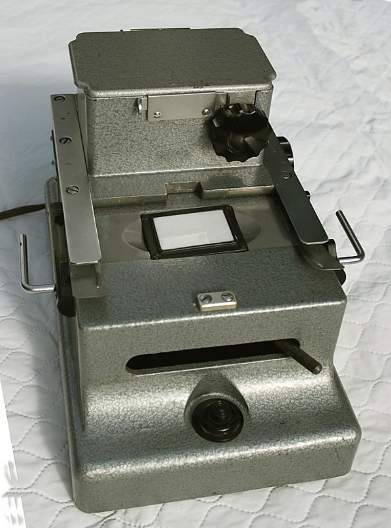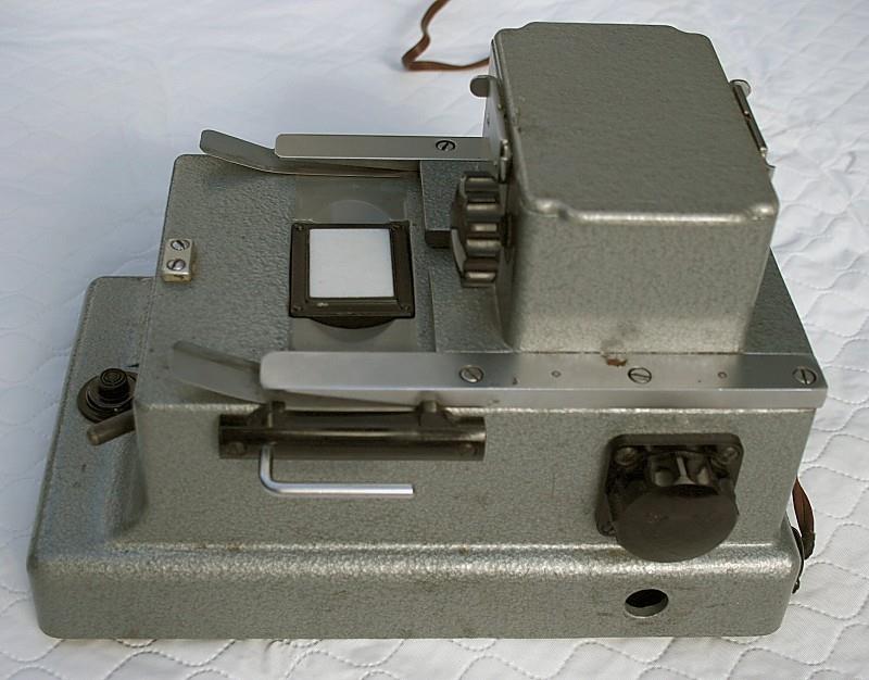 The AKD-55 is a slide duplicator manufactured by KOMZ in the 1960s. The slide or negative to be copied is placed over the opal screen and the film magazine is then slid forward over it. The illumination is provided by low voltage lamps, the intensity of which can be controlled by a rheostat. The slide or negative is pressed into contact with the film in the magazine by means of the lever on the front of the unit. The exposure is made by pressing the button below this lever. There is no provision for control of colour by means of filters, so I assume that the unit was used only for black & white. The fourth photo shows the inside of the film magazine, which incidentally has no frame counter. The whole unit is packed in a wooden box.