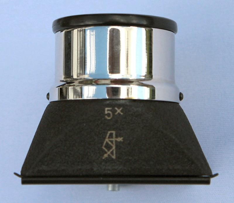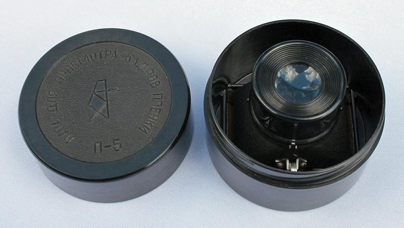 The L-5 Lupe was made by the KOMZ factory in Kazan. It is designed for 35 mm film, which is fed through the slots at the bottom. It has a magnification of 5x. The eyepiece can be raised and lowered to adjust the focus. The lever on the side of the unit, notches the film.