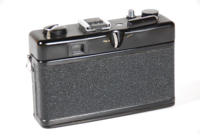 FED-50 is a viewfinder camera with manual override. The FED-50 camera is finished all in black with gold lettering. Focusing is by distance scale on the lens or symbols in the viewfinder. Shutter speeds are visible in the viewfinder as is a parallax frame for close-ups. The back is hinged. FED-50 camera has a soft black or beige vinyl zippered case.