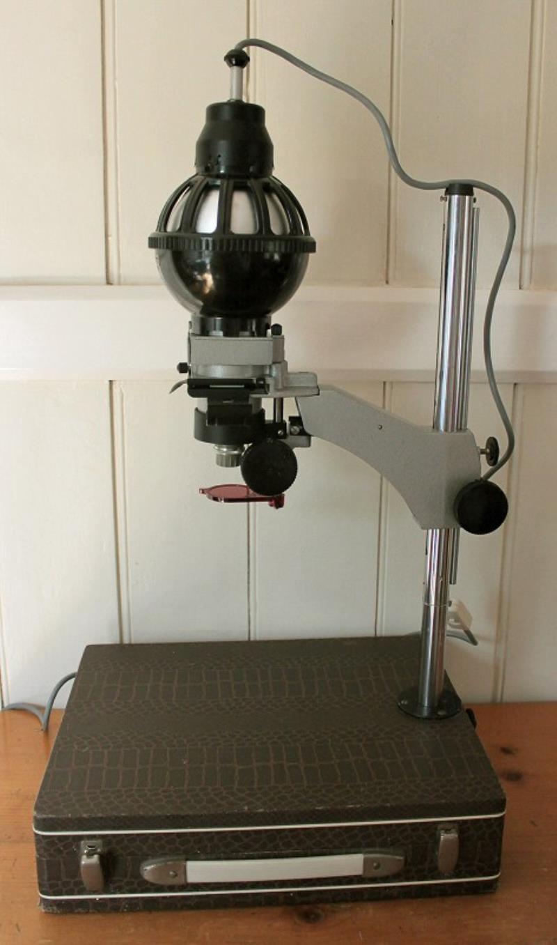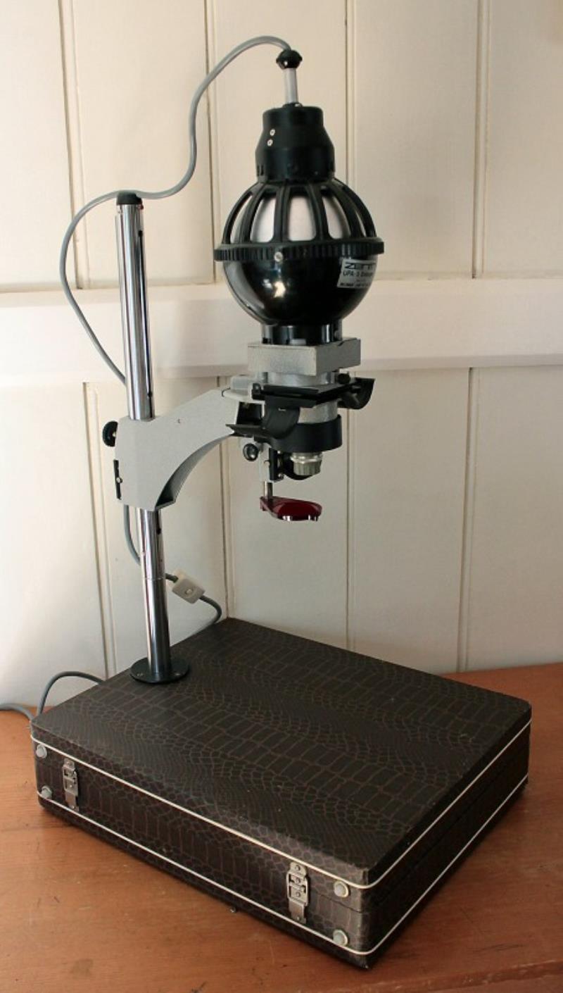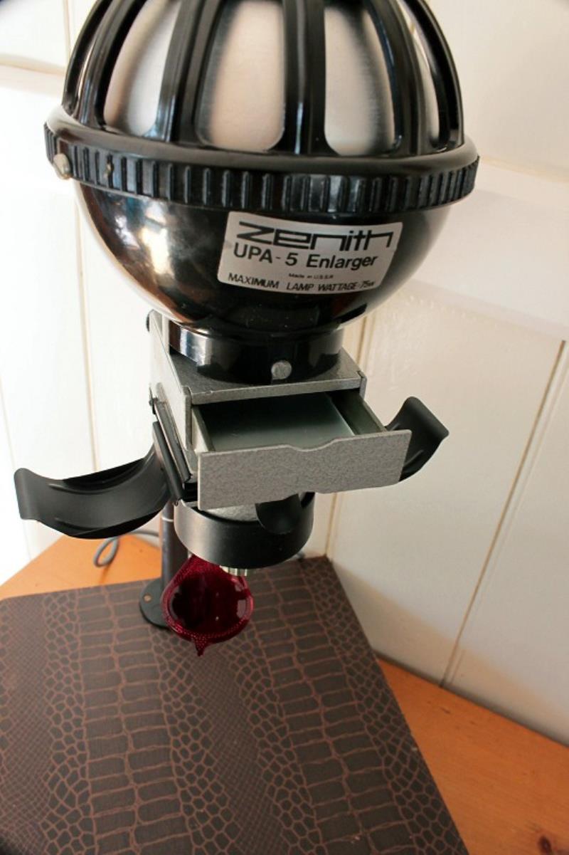 The UPA-5M enlarger is portable and uses its own carrying case as a baseboard. It is a 35 mm full frame enlarger and has masks for half-frame and 10 x 14 mm. The lens (photo 4) is an Industar-50Y f/3.5 53.5 mm. It uses a 75 watt lamp. There is a filter drawer (photo 3) for colour correction.Autofocus is available in the 2.5x to 8x magnification range. Above 8x upto 20x the focus is manual.