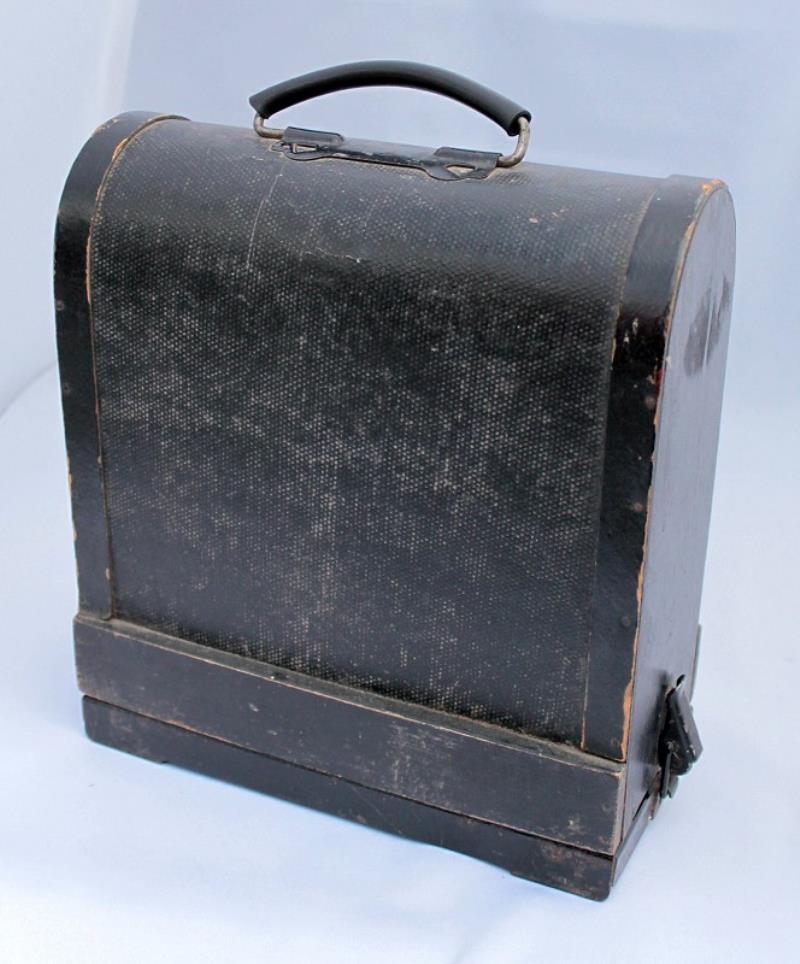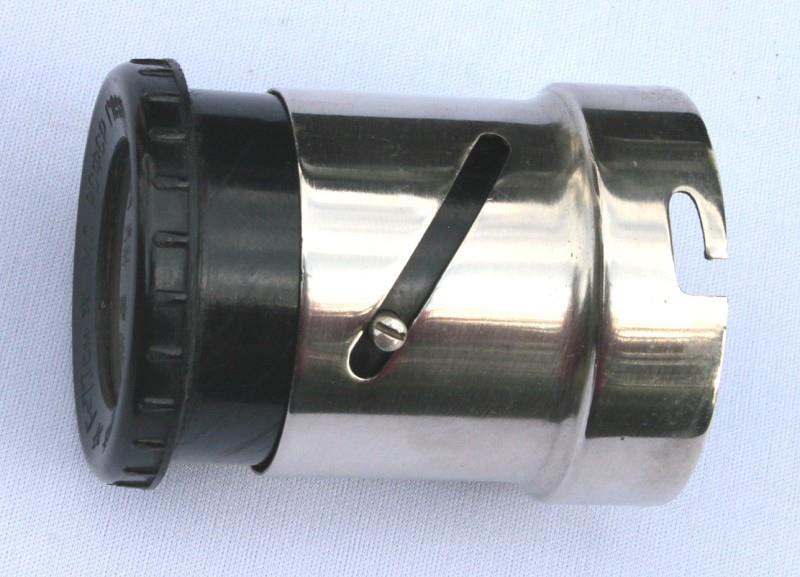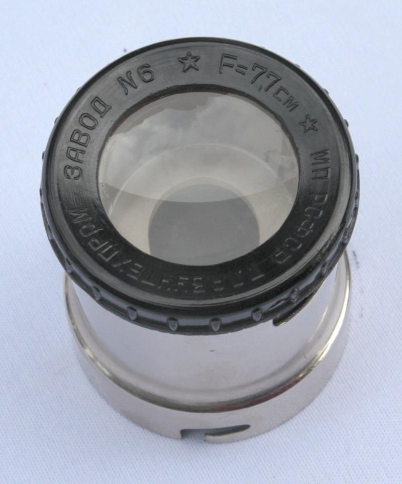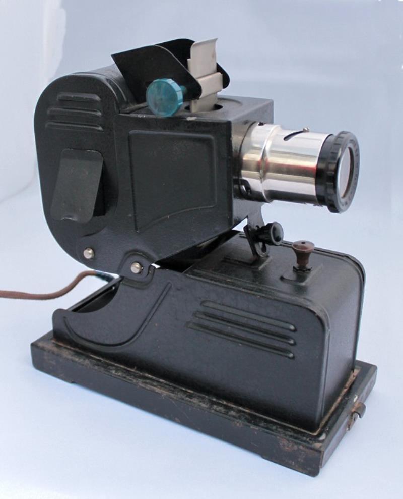 This filmstrip projector was probably manufactured in the 1950s. There is no indication of its make or model number on the body of the projector, but the lens surround has the marking: MP RSFSR Glavuchtechprom Factory No 6. The projector is for 35mm filmstrips and the lens has a focal length of 7.7cm. A removeable cap on the base, allows jumpers to be set for 220, 120 or 8 volts.