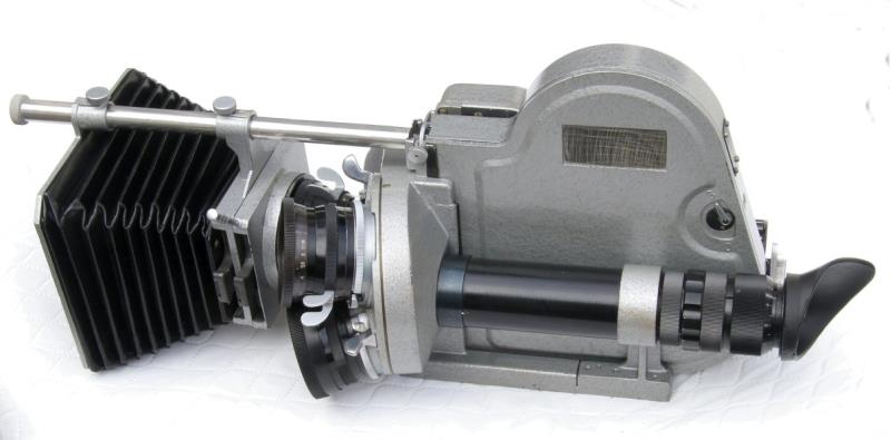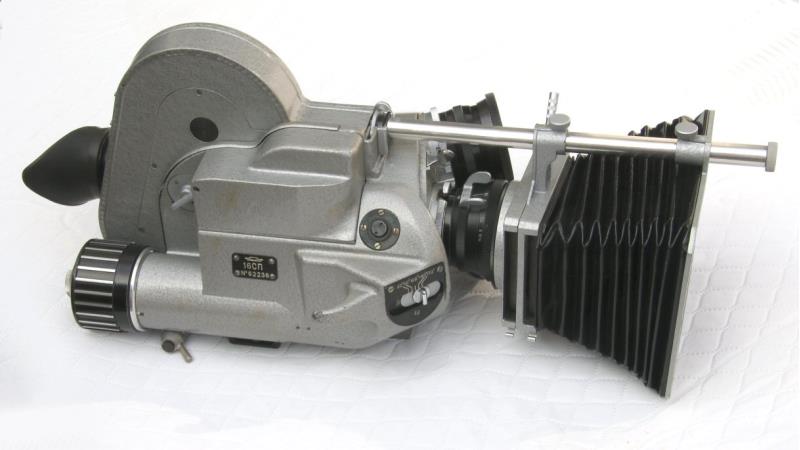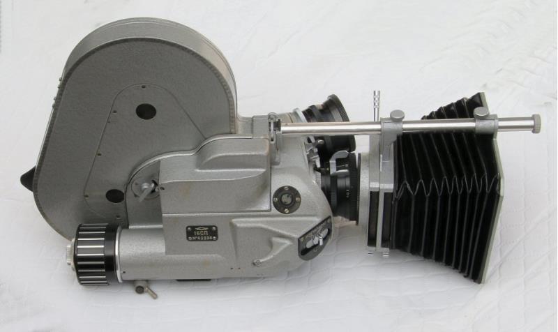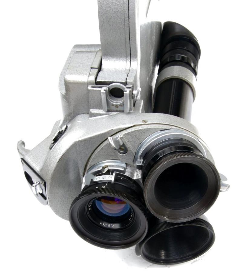 The 16SP (16СП) movie camera, manufactuted by KMZ, is a 16mm camera based on the design of the Arriflex 16. It is driven by a 6-8 volt 20 watt electric motor, type 25M-11. The camera ios capable of film speeds of 8, 16, 24. 32. 48 and 64 fps. It has a three lens turret which is fitted with a f/2.8 10mm OKS1-10-1, a f/2.8 15mm OKS2-15-1 and a f/2.5 25mm OKS1-25-1 lens. The camera can be comes with 30 or 60 metre film magazines. The last photograph shows the camera with the 60 metre magazine fitted.