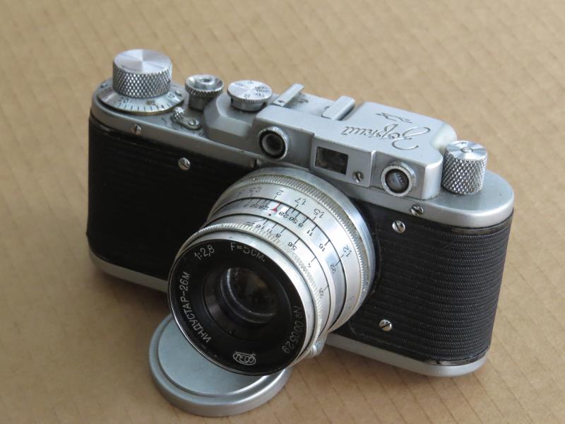 This camera was equipped with a very early Industar 26M with big ciphers (certainly not original) when bought.