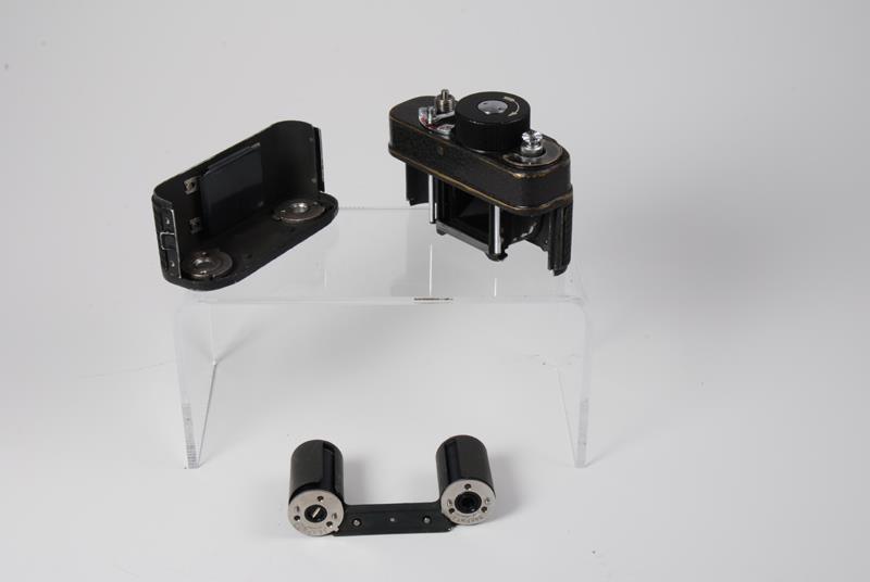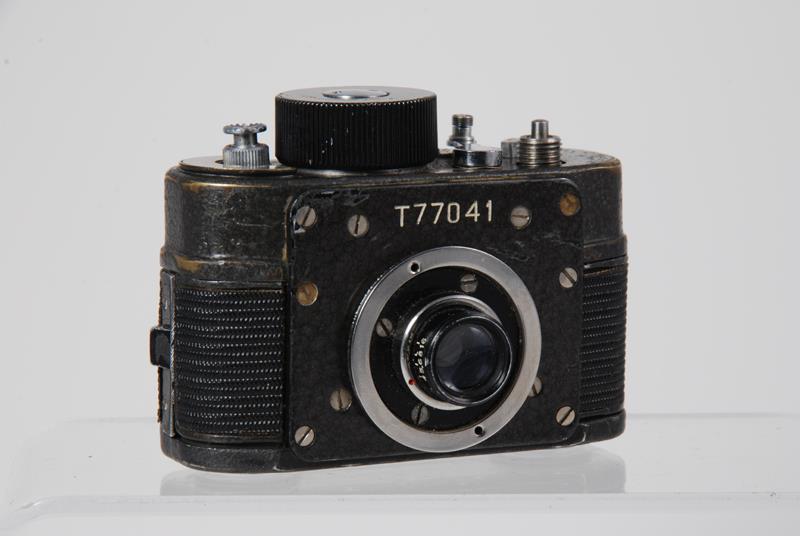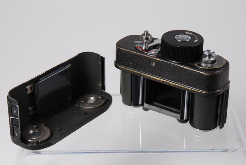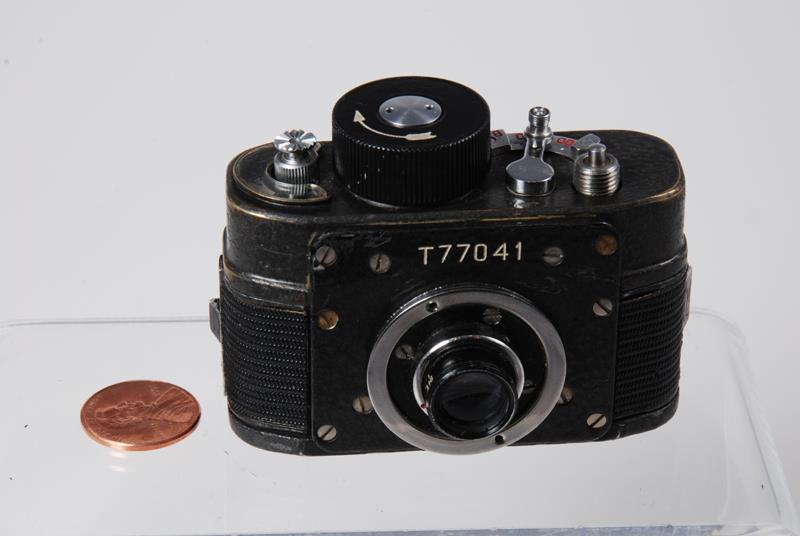 There were many attachments for the F-21, all intended to conceal it in different ways. There are belt buckles, coat buttons, purse and bag adapters. There are ordinary 35 mm cameras and umbrellas that could accommodate the small F-21. Some accessories, like the button, were made in small quantities, some - in single units. The standard lens is OF-28T, 28/2.8, coated. There are 4 shutter speeds - B, 1/10, 1/30, 1/100. Produced in 1951-1995. (source: www.fedka.com).