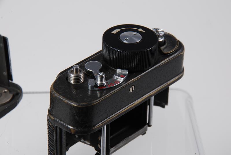 The F-21 is a famous Soviet-made photo camera for concealed use; a spy camera in simple words. This model was in production at KMZ plant from 1951 to mid-1990's. This camera was designed and made with its purpose in mind - it is very small, light, can shoot the entire roll of film from one fill wind of its spring-loaded motor. Picture quality was, of course, very important as well, so the F-21 features a very sharp, high-resolution lens and a reasonably large negative size. The frame is 18x24 mm, taken on a 21 mm film. So technically, using the 35 mm terms, the F-21 is a half-frame camera.