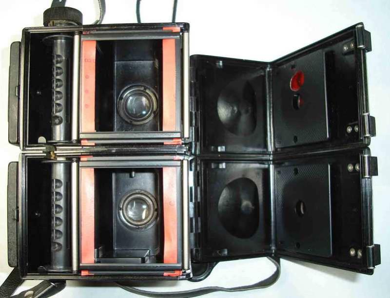 This is quite an interesting unit, definately homemade, no question about it. Seems to be Lubitel and Lubitel 2 strung together, having connected film advance mechanism. That is pretty much the only thing that is connected on these 2 units. The focusing is uncoupled and the shutter release is accomplished via 2 cable releases taped together.